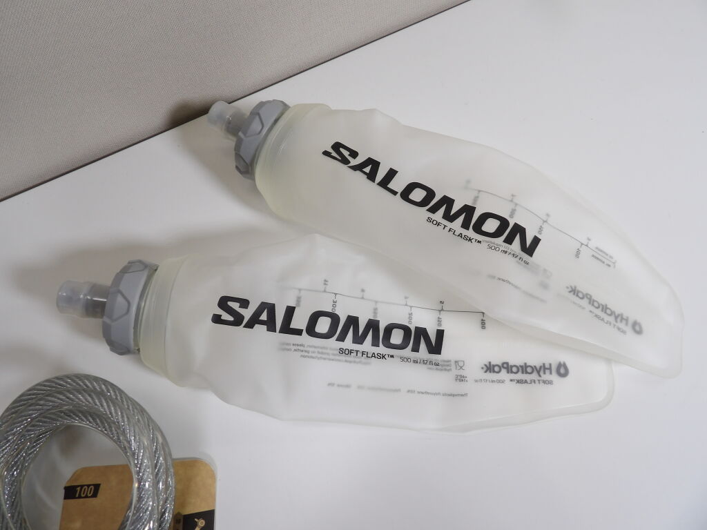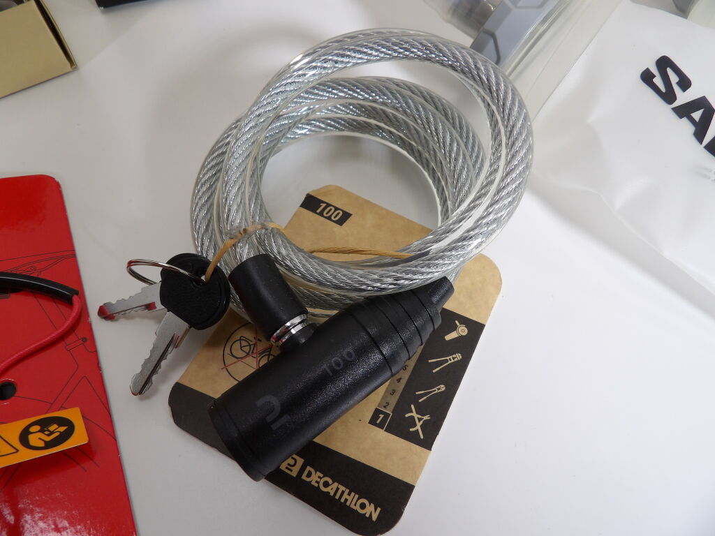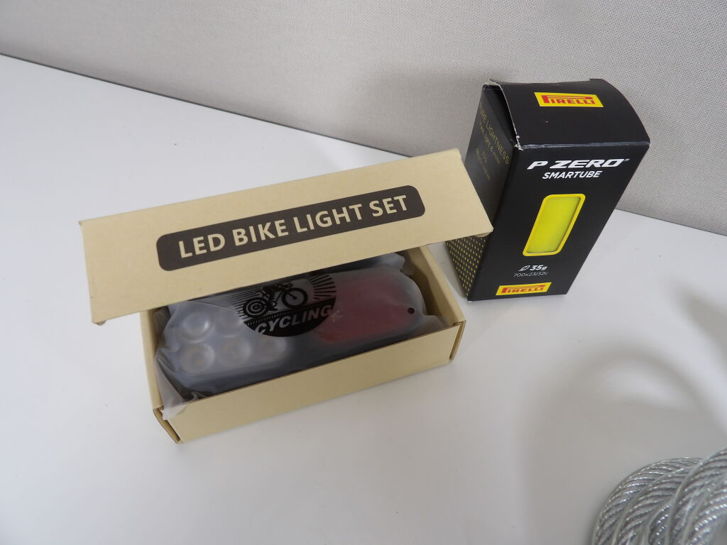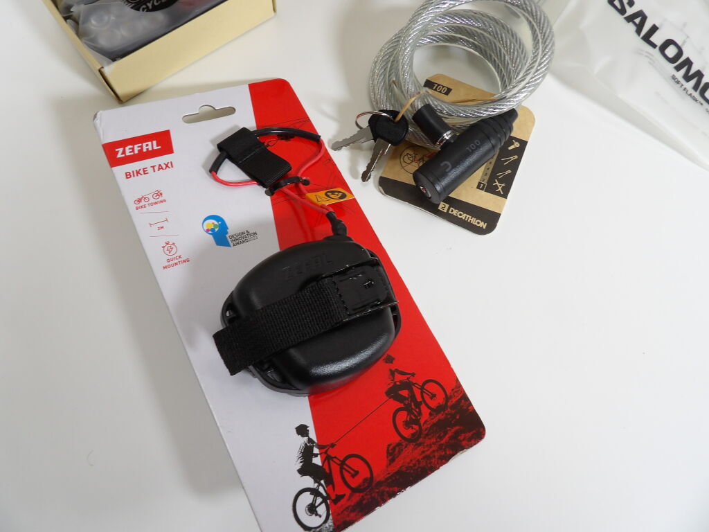 CYCLISME : Lot de x6 Accessoires neufs : Antivol à clés (pour attacher son casque au vélo), Zefal Cable de remorquage Bike taxi, Lumière vélo LED, Chambre a air P ZEO Smartube 35g, et x2 flasks SALOMON neuves.