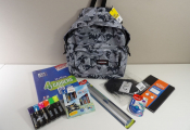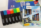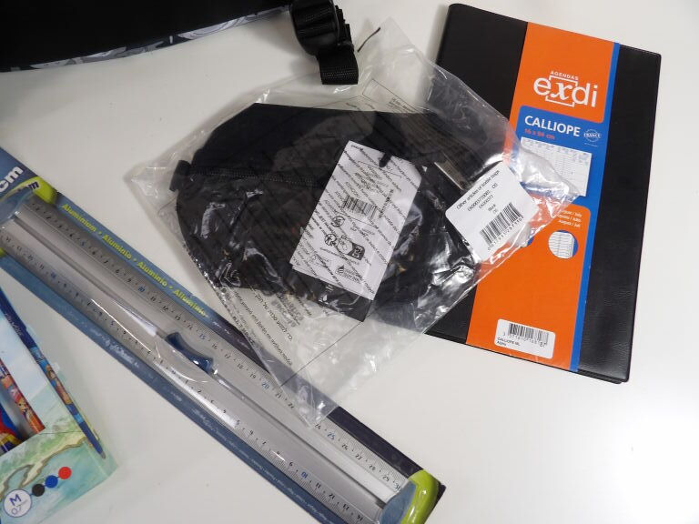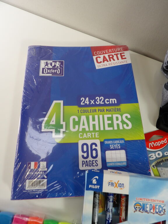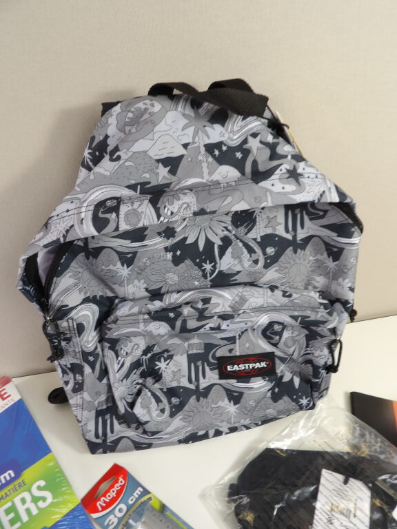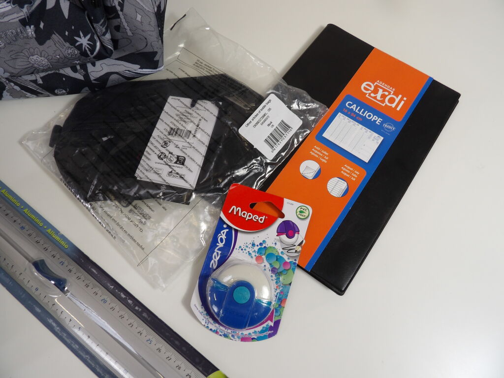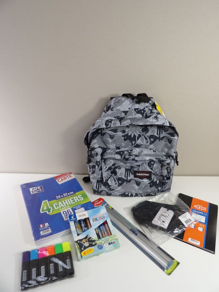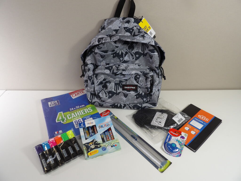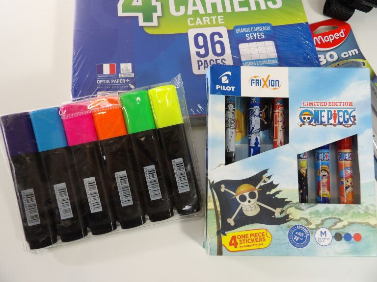 On y inclut quelques fournitures scolaires : Lot de cahiers, gomme, règle, agenda, crayons Pilot frixion ONE PIECE, marqueurs, et une trousse noire EASTPAK.