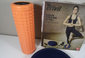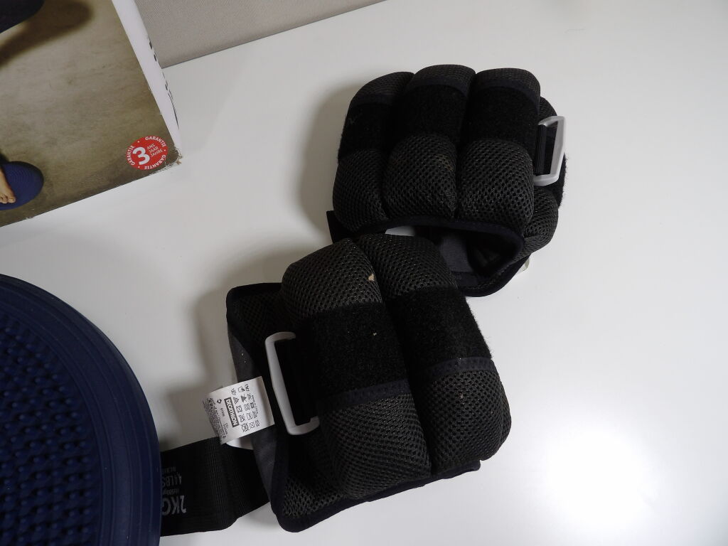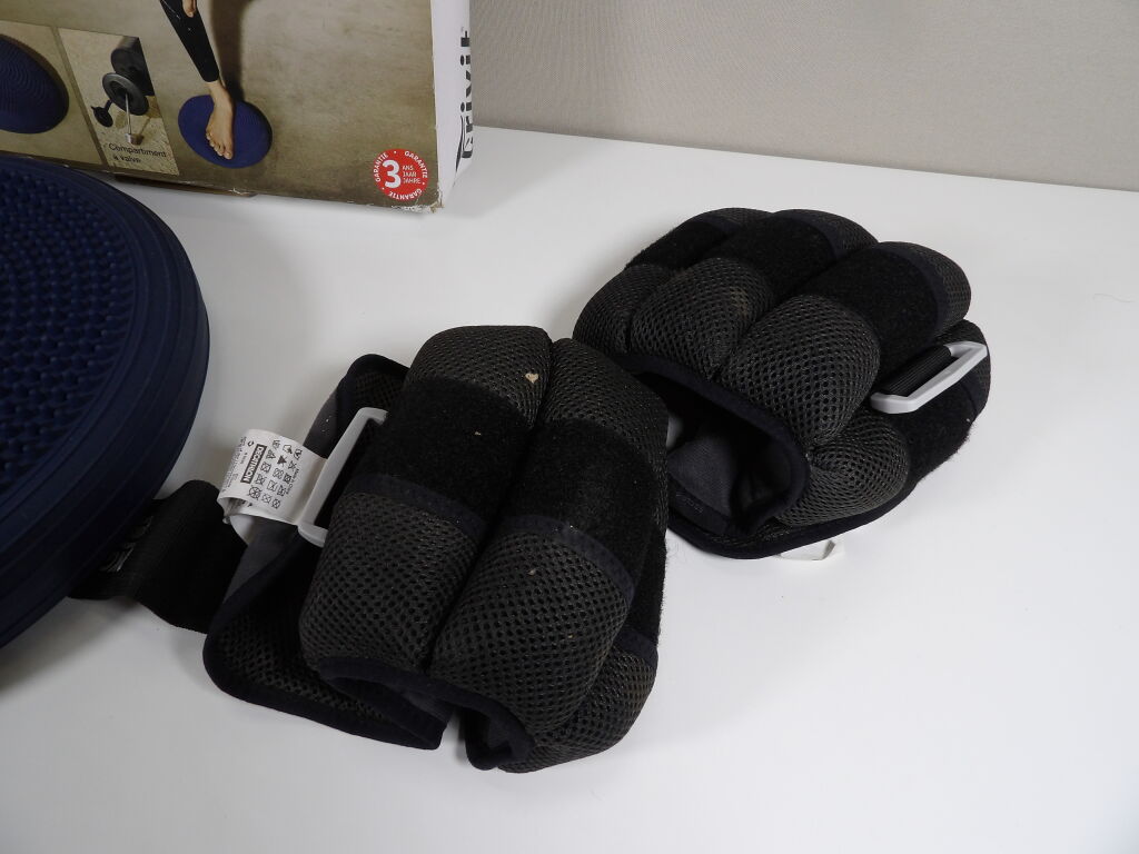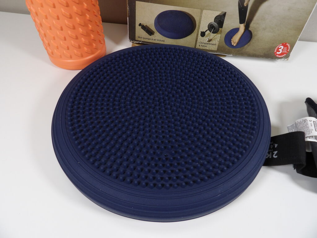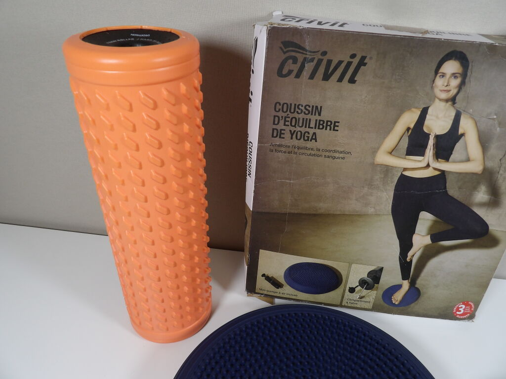 FITNESS / YOGA Lot de x3 articles d'occasion: rouleau de massage dur DECATHLON, x2 athèles de 2KGS qui se scratchent (état satisfaisant) et coussin d'équilibre de YOGA.