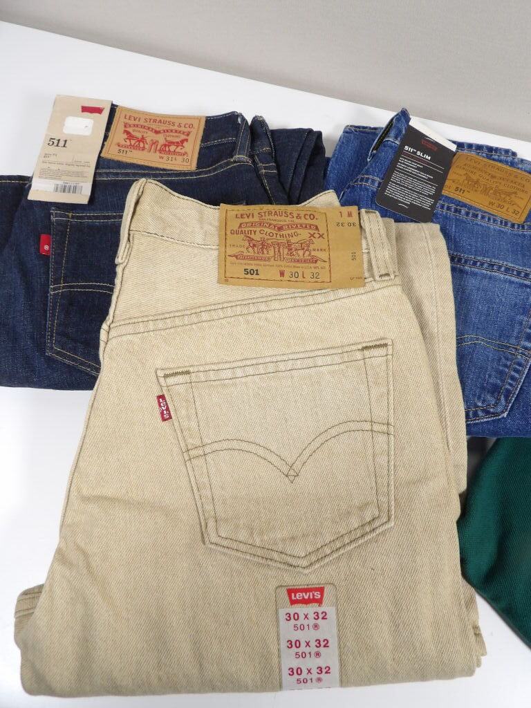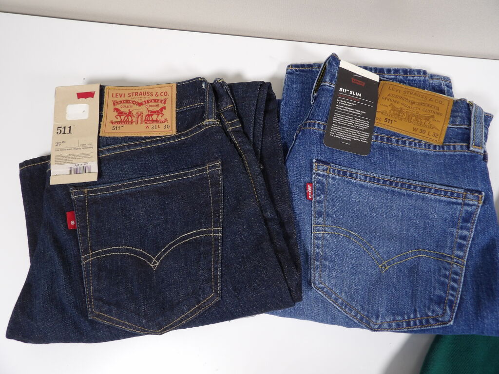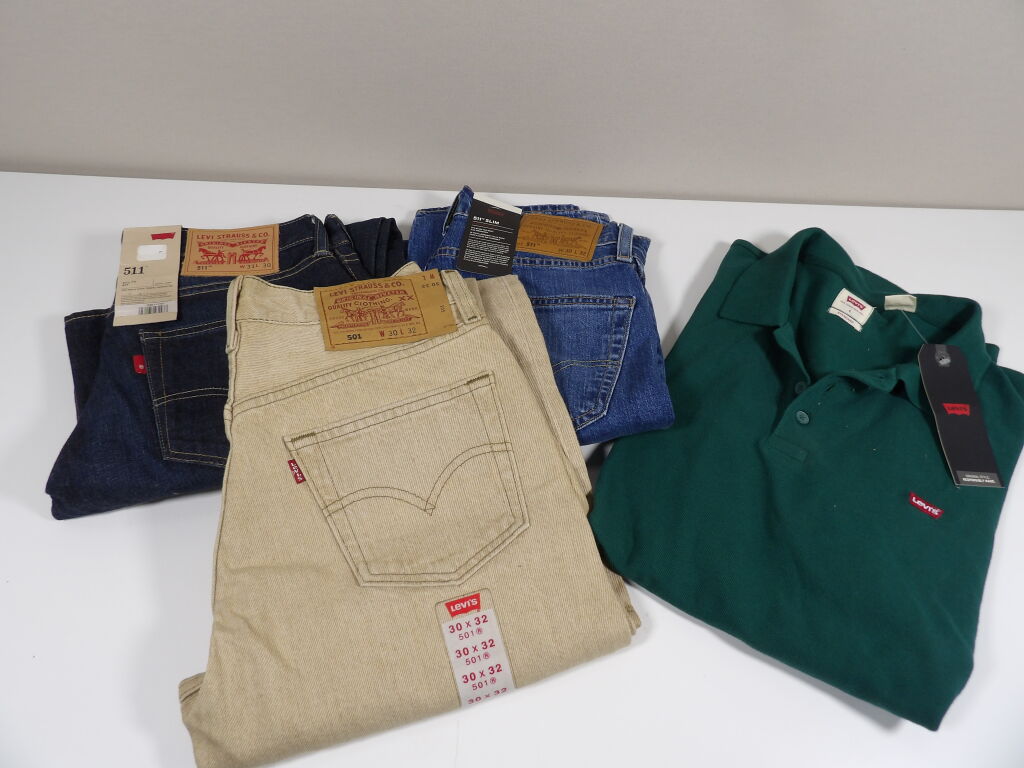 LEVI'S: Lot de x3 jeans NEUFS : 511 SLIM en W30 L32 jeans clair, et W31 L30 en brut, ainsi que 501 en W30 L32 beige. On y inclut un polo vert neuf en L.