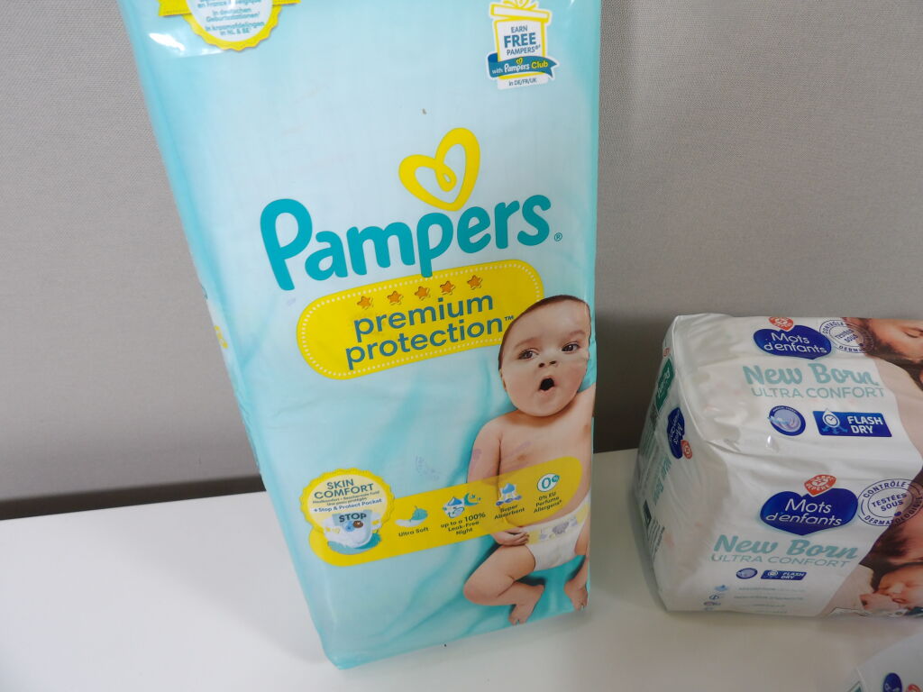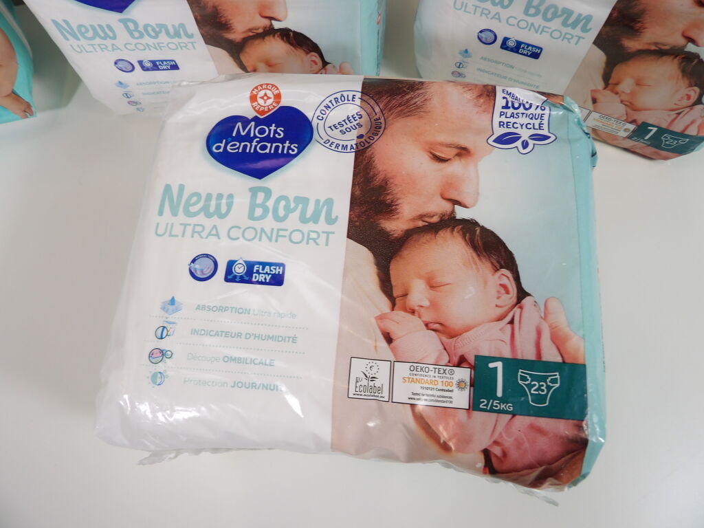 Lot de 111 couches NEUVES en taille 1 (2-5 kilos) : Pampers premium protection x42 et Mots d'enfants x69.