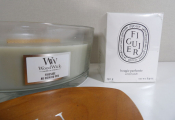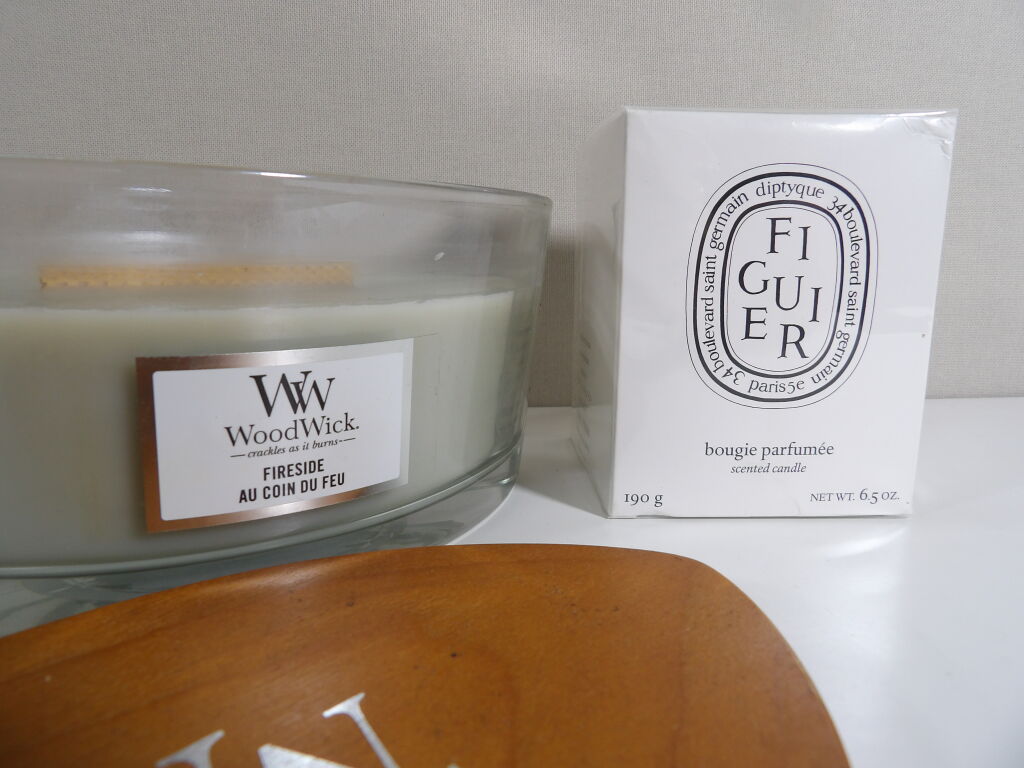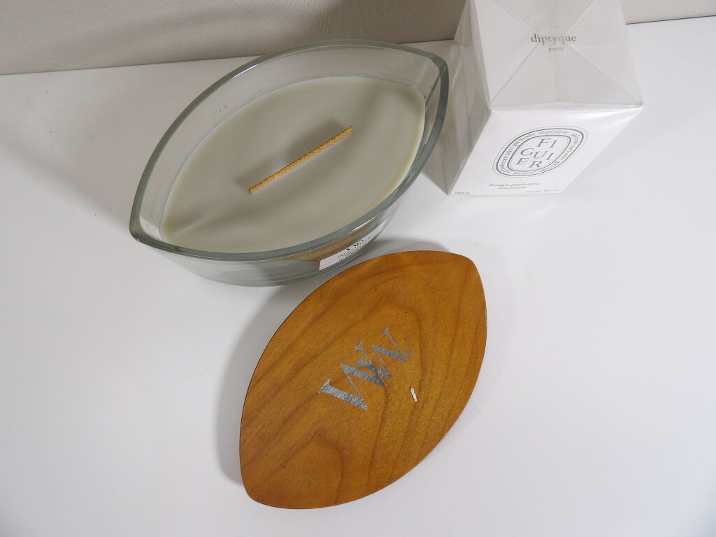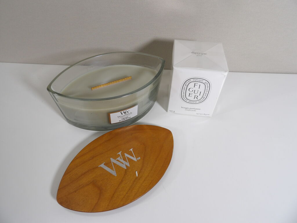 Lot de x2 bougies NEUVES dont DIPTYQUE Figuier 190g, et WoodWick FIRESIDE au coin du feu 453,6g.