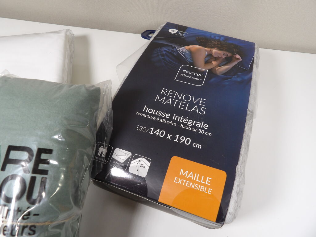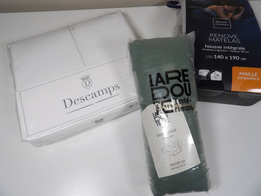 Lot de x3 draps neufs : LA REDOUTE drap housse coton lavé 90x190CM, RENOVE MATELAS housse intégrale maille 140x190cm et DESCAMPS percale en coton peigné 240x220CM Housse de couette.