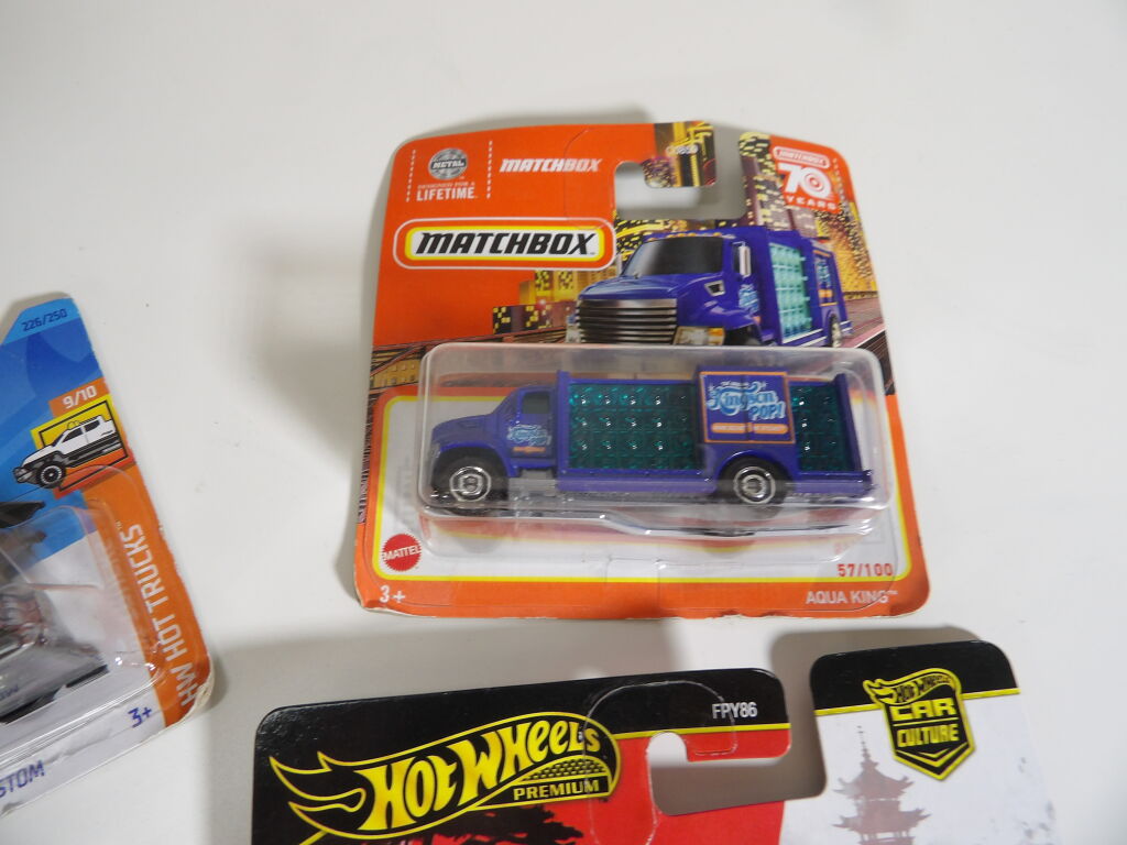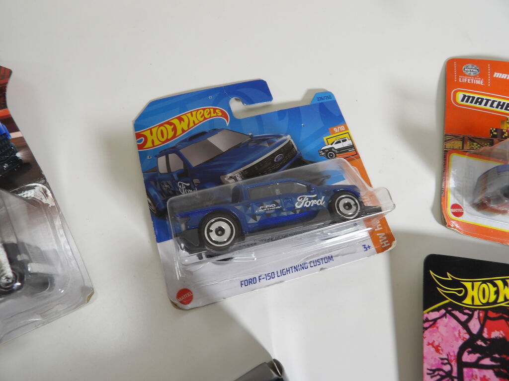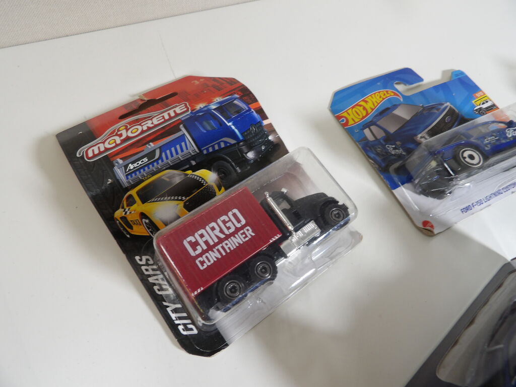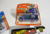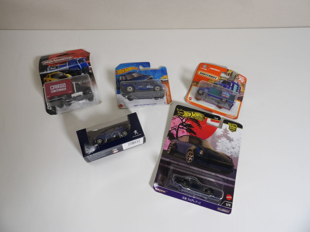 Lot de x5 petites voitures : HOT WHEELS, MATCHBOX, MAJORETTE, et Peugeot 208.