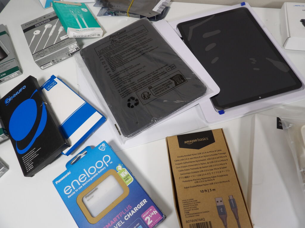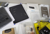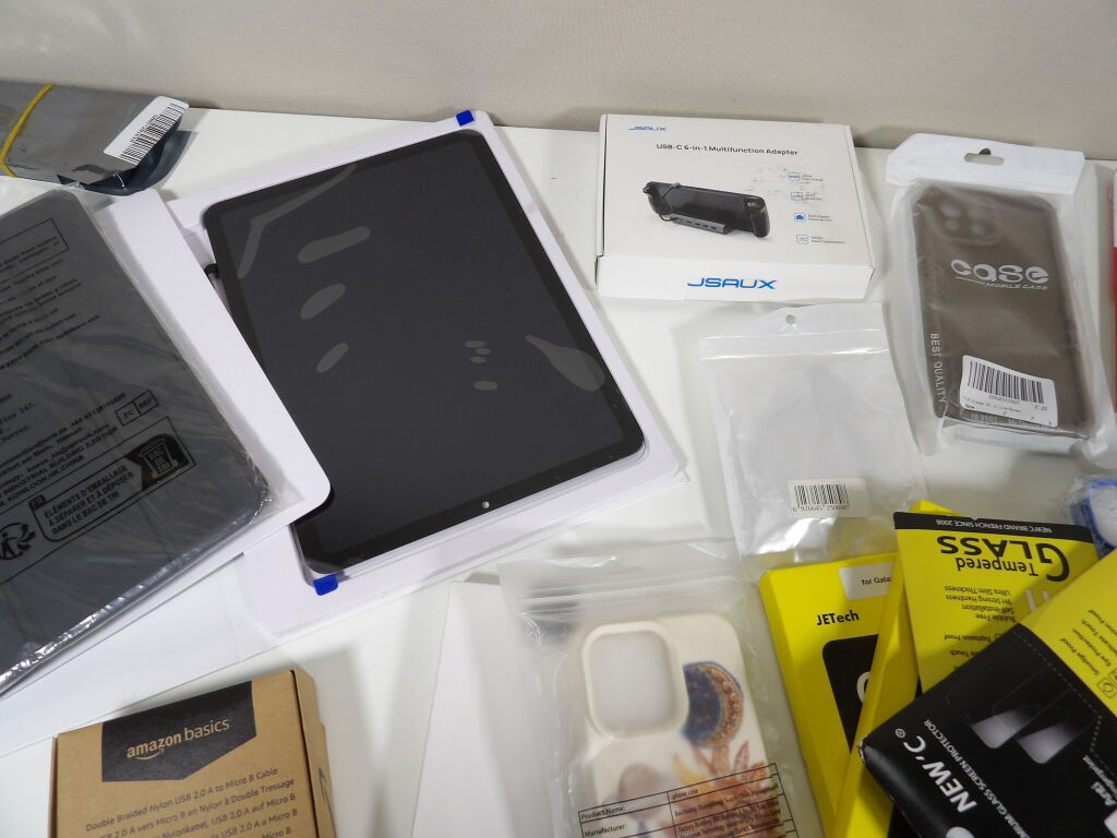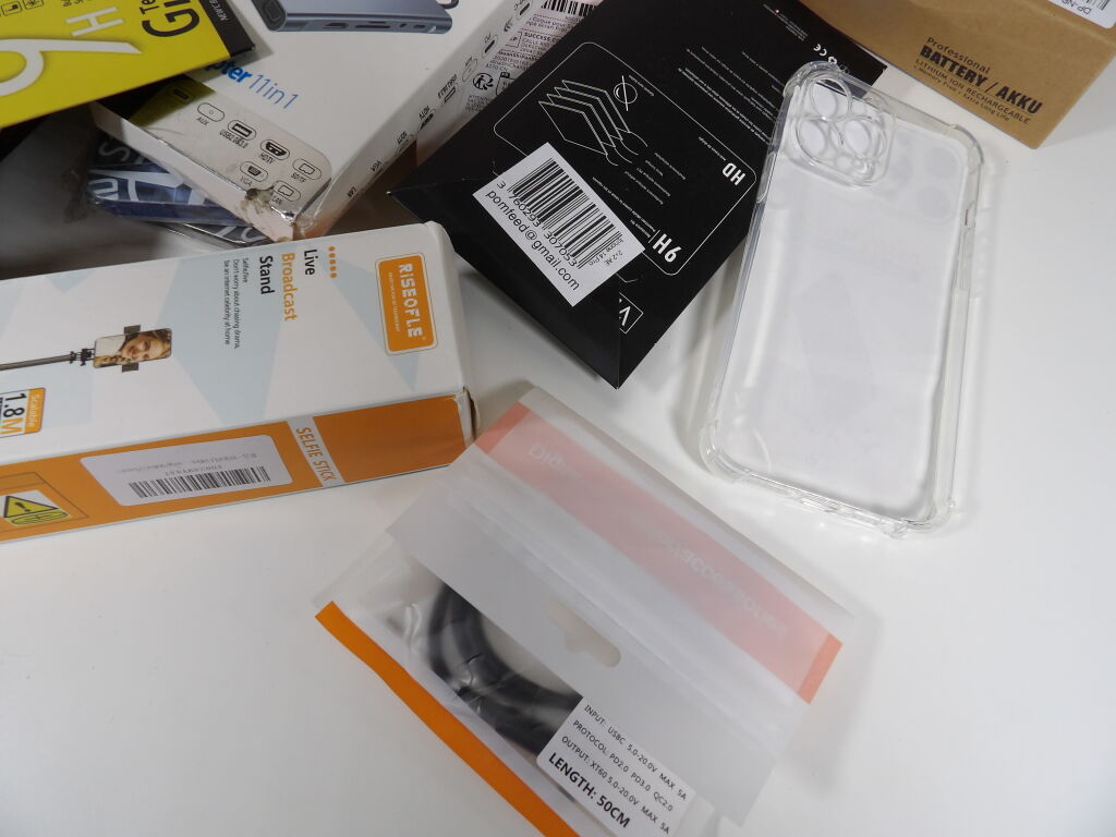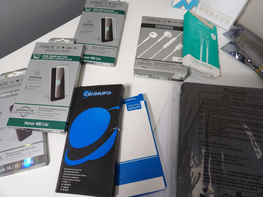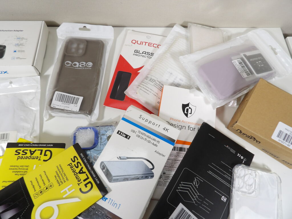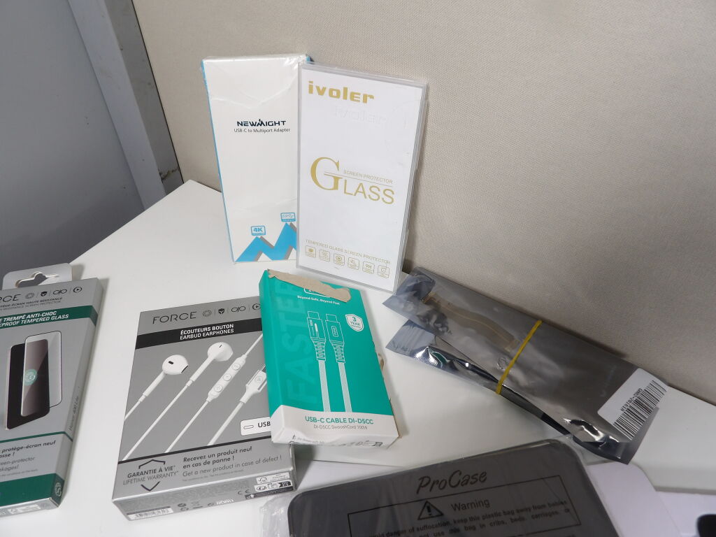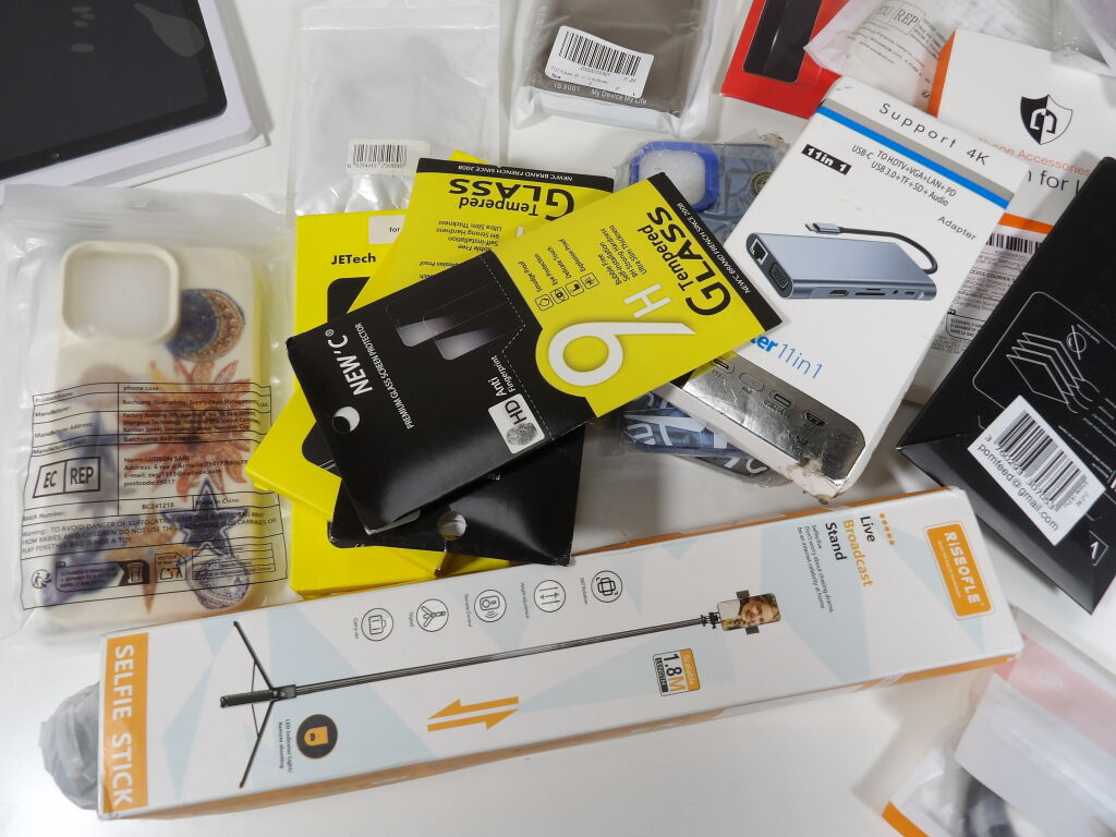 Lot d'une trentaine d'accessoires divers pour téléphone, principalement neufs: coques, cables, protection, selfie stick...et tablettes.