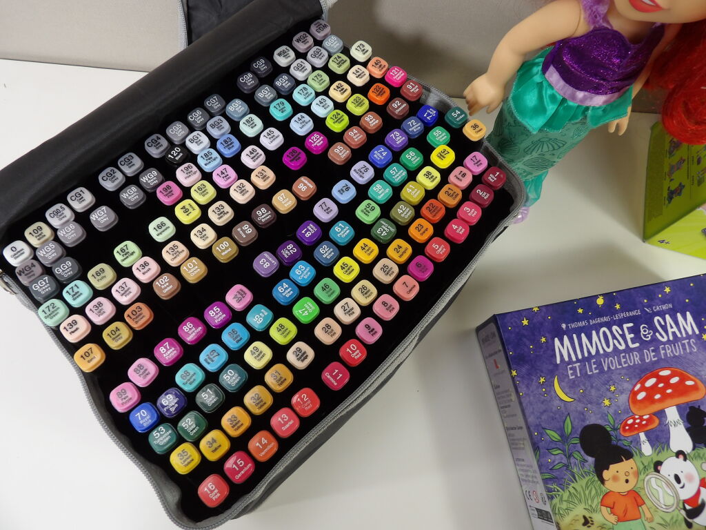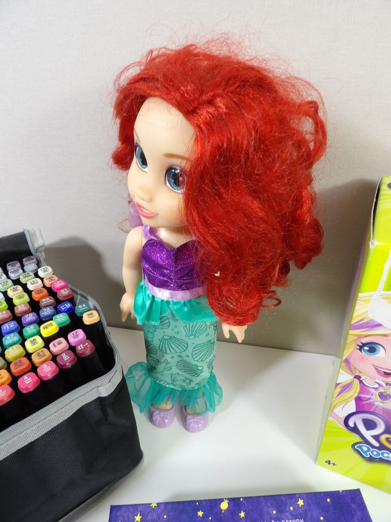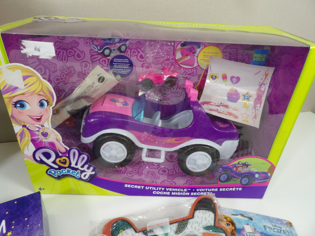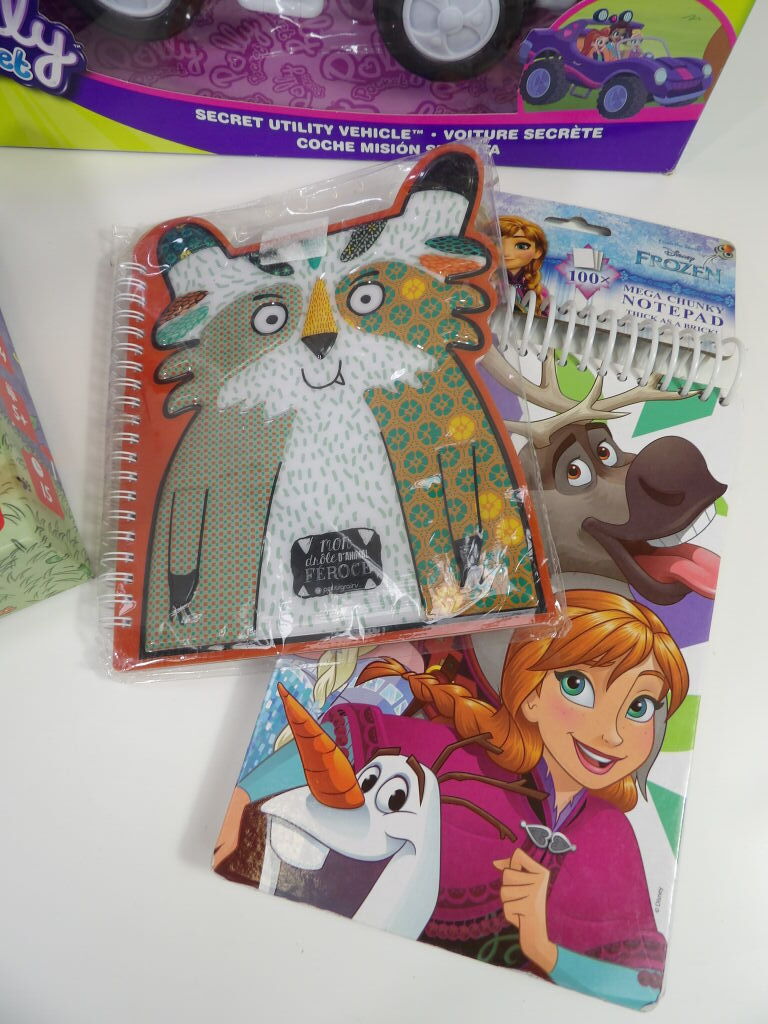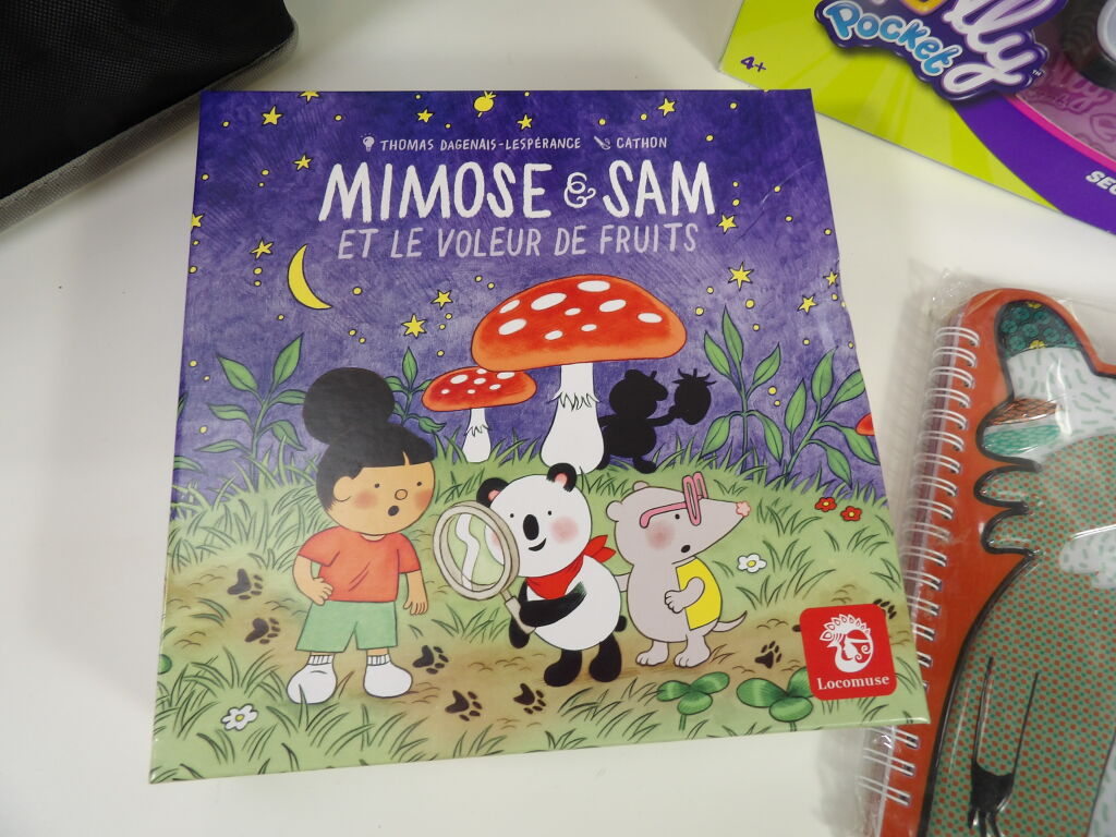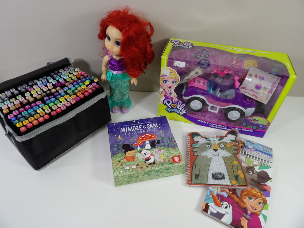 Lot ENFANT neuf et d'occasion : POLLYPOCKET Voiture, Poupée ARIEL, x2 carnets et lot de feutres; ainsi que le jeu MIMOSA et SAM et le voleur de fruits neuf.