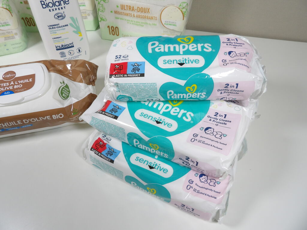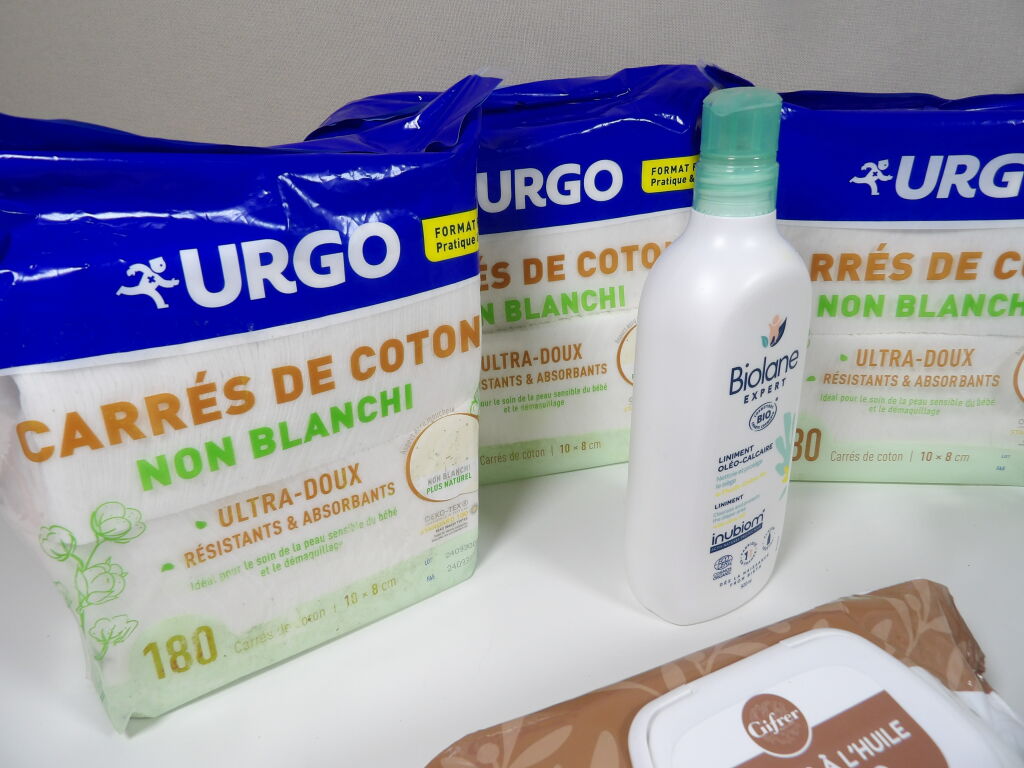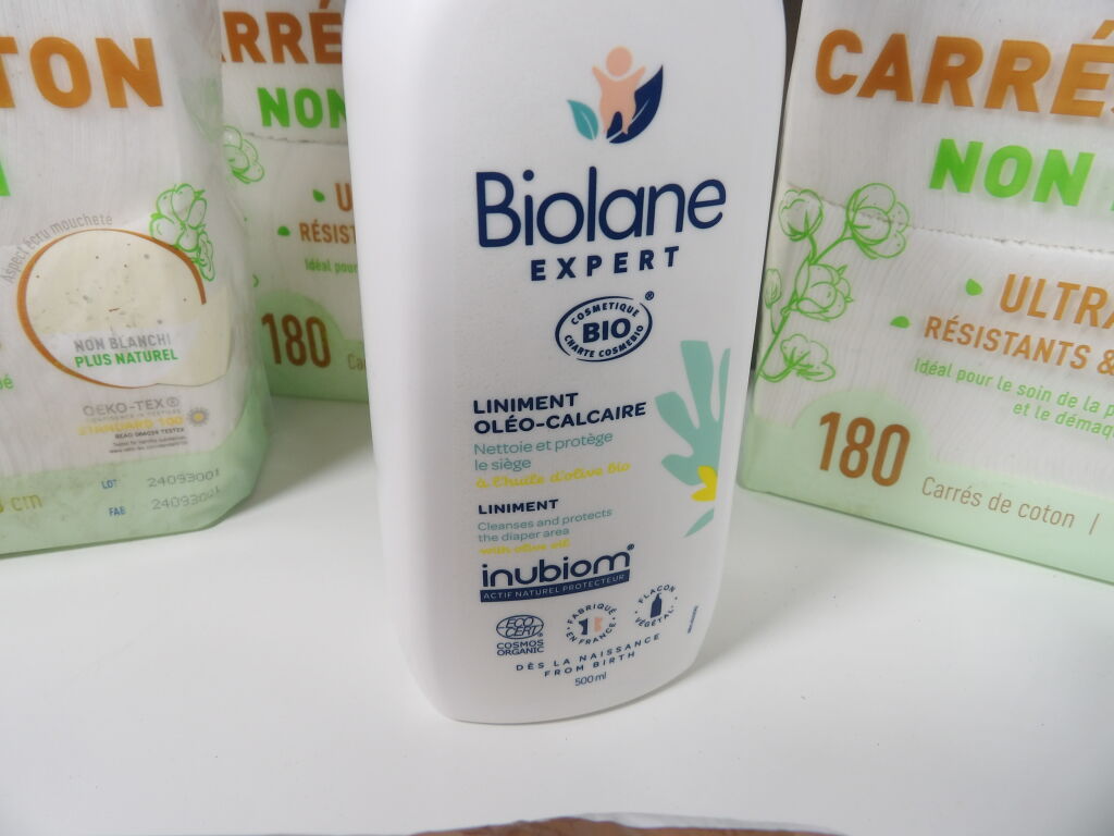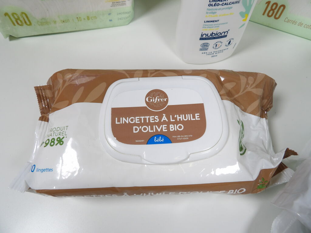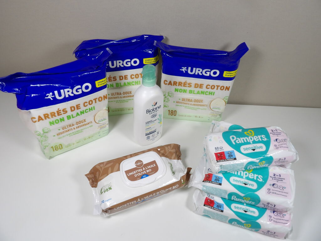 Lot SOINS bébé neuf : x3 packs de carrés de coton non blanchi (180), x6 paquets de lingettes PAMPERS sensitive, x1 pack de lingettes à l'huile d'olive bio et x1 liminent oléo-calaire de 500ML BIOLANE.
