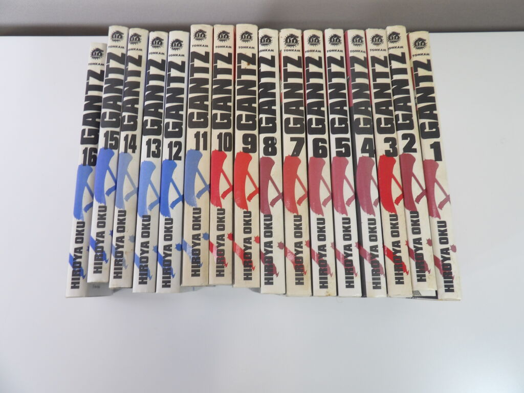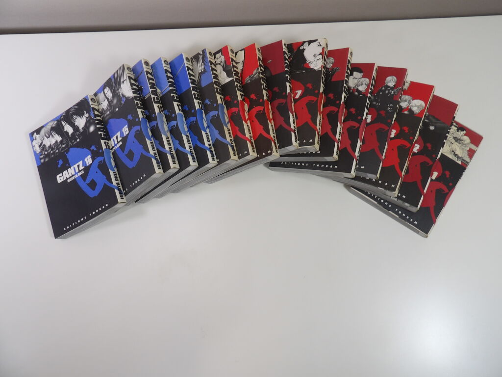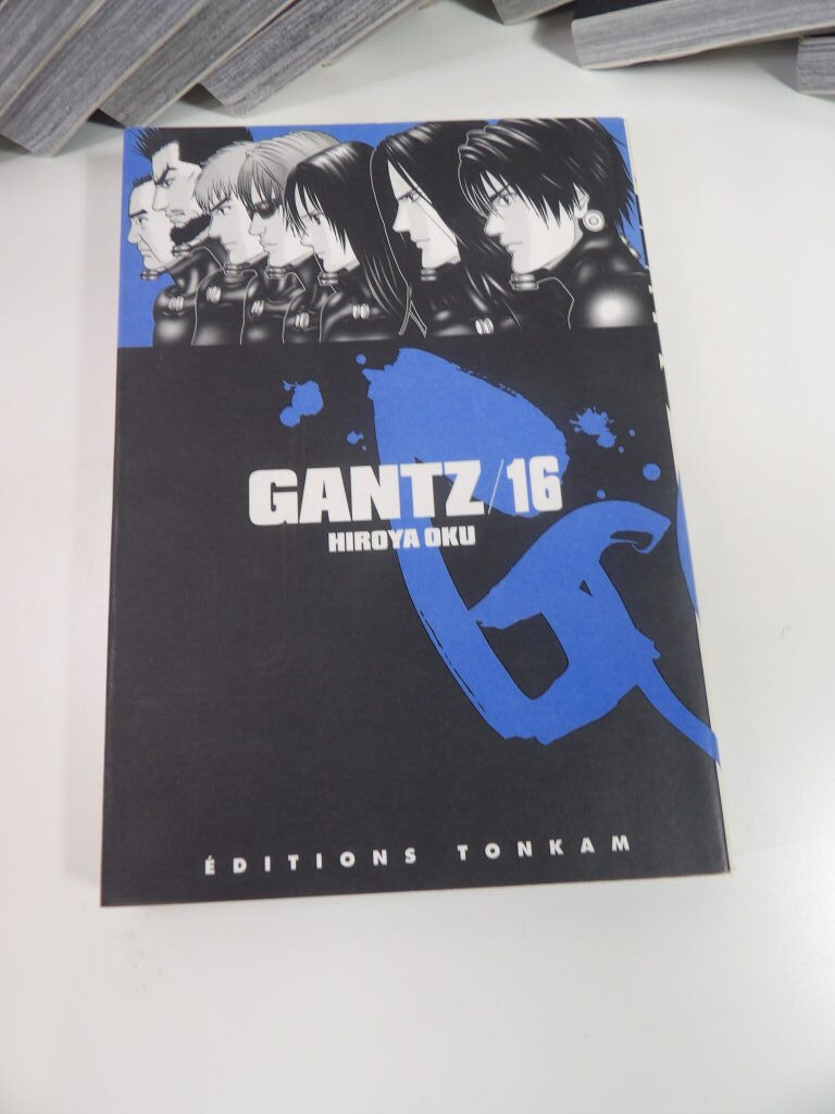 Mangas les 16 premiers tomes de Gantz par Hiroya Oku aux éditions Tonkam (pour public averti) quelques pages détachées traces sur les jaquettes .