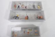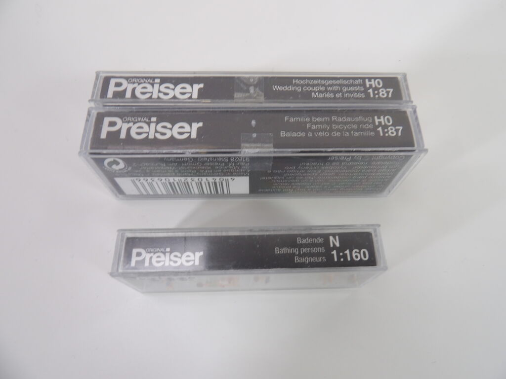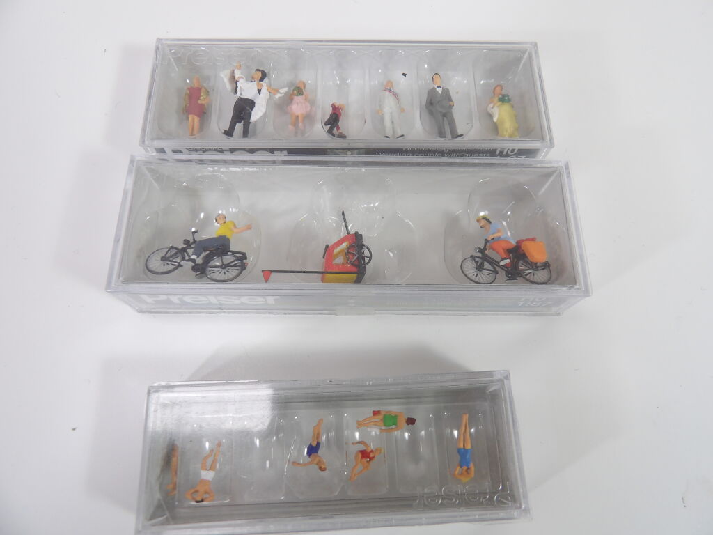 Modèles réduits ferroviaires / diorama : 3 ensembles de personnages de la marque Preiser : le mariage (n°10790) et les cyclistes (n°10636) à l'échelle HO et les baigneurs (n°79071) à l'échelle N