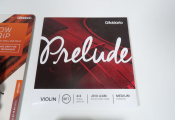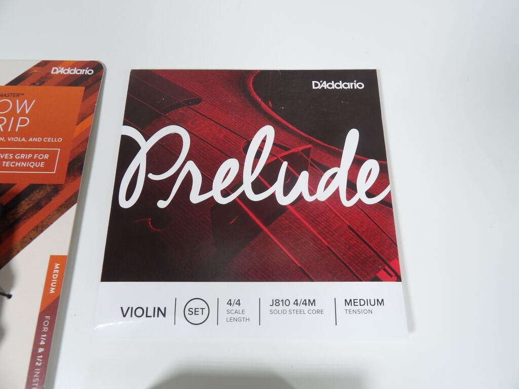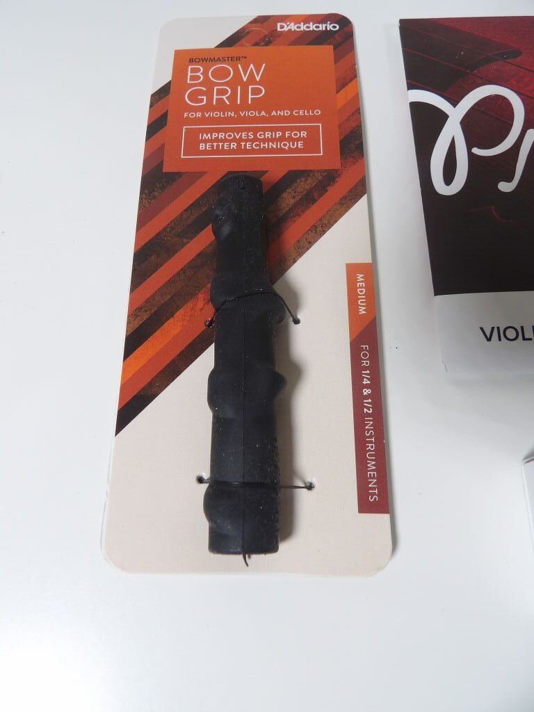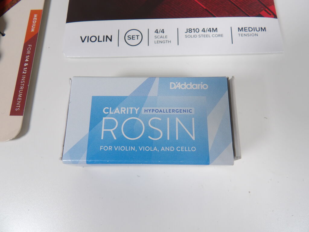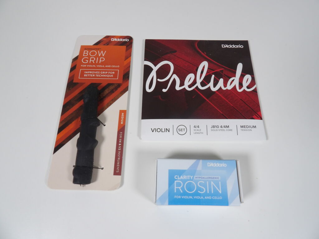 Musique : jeu de cordes pour violon, on y joint un bloc de colophane et un grip aide à la prise de l'archet
