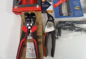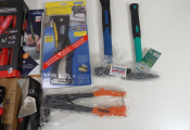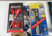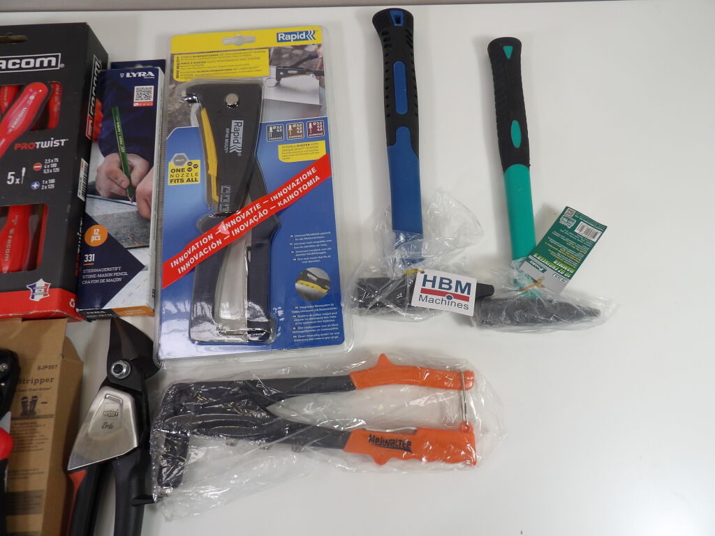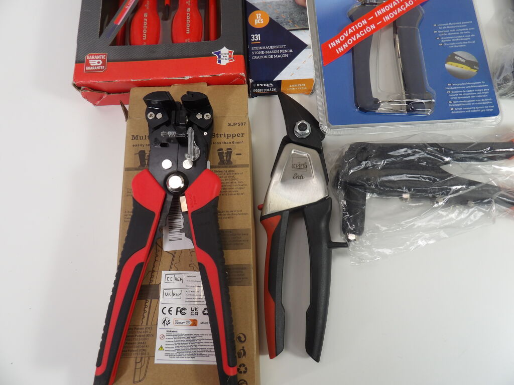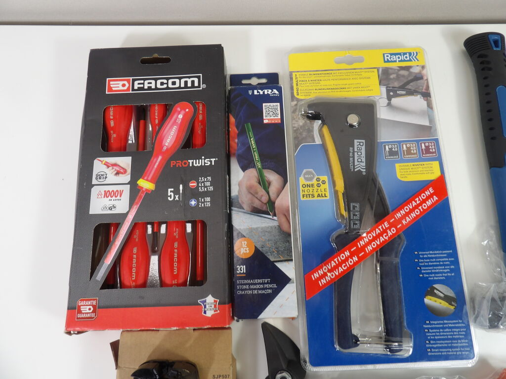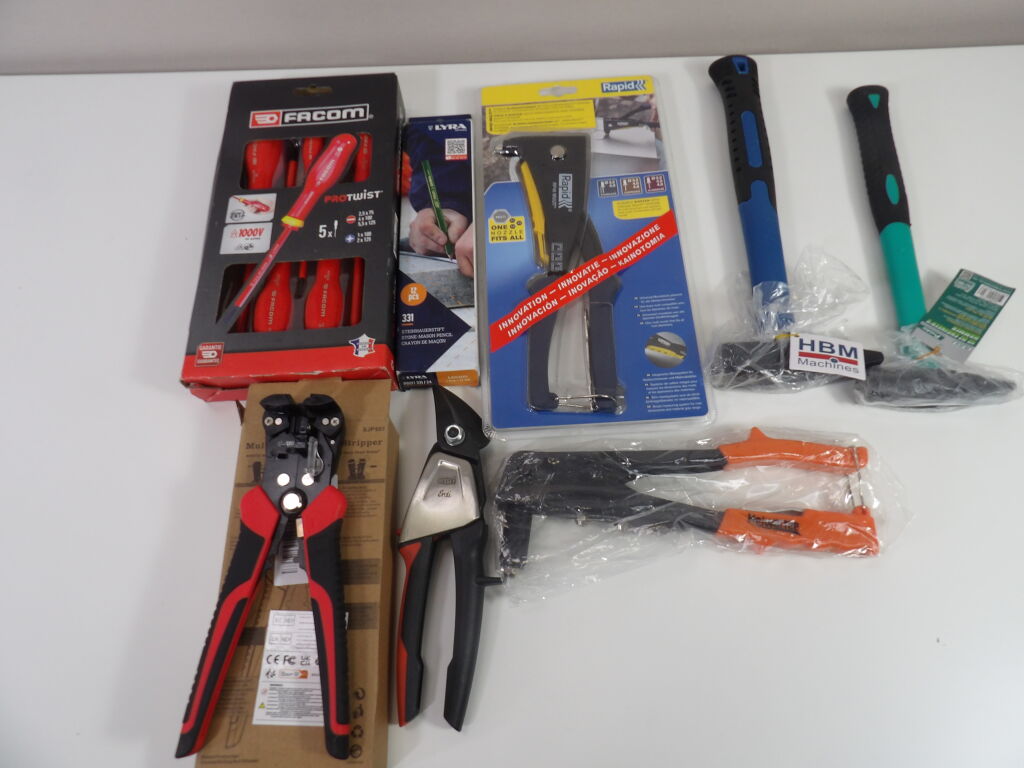 Outillage : lot de 8 articles neufs dont un set de 5 tournevis plats Facom, 2 pinces à rivets, pince multiservice, 2 marteaux, crayons de chantier.