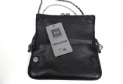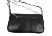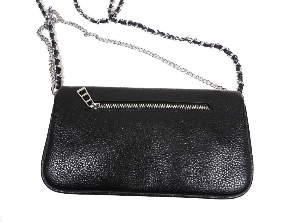 Pochette en cuir grainé à double chaînes cuir et métal et ailes ornées de strass.