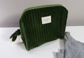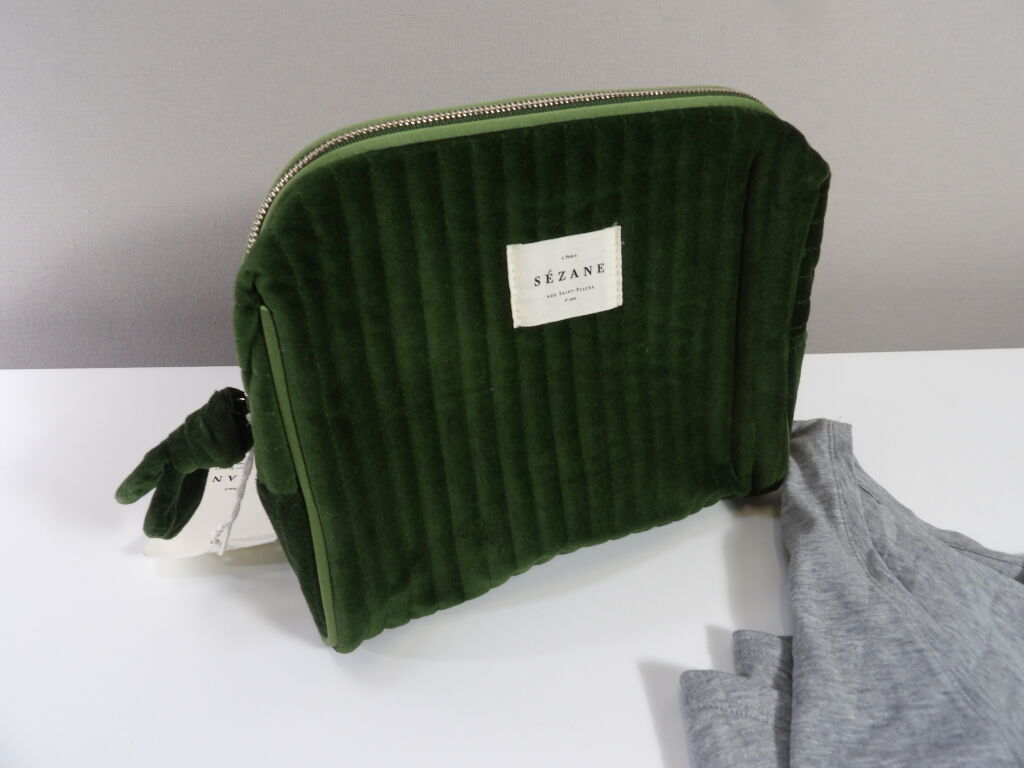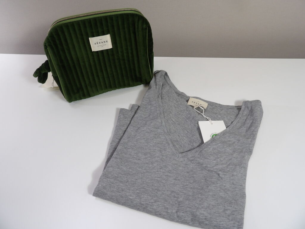 SEZANE x2 articles: Tshirt gris MALCOLM et Robe courte SALITA, en taille 36/S. On y inclut une trousse de toilettes verte en velours.