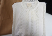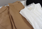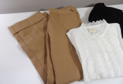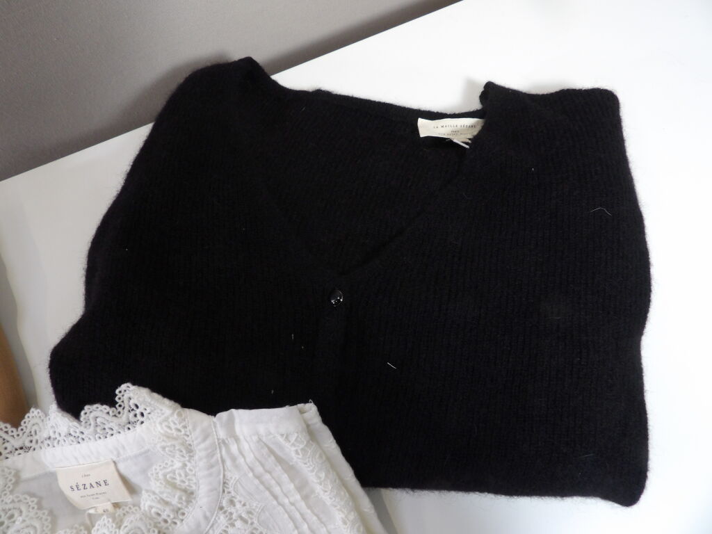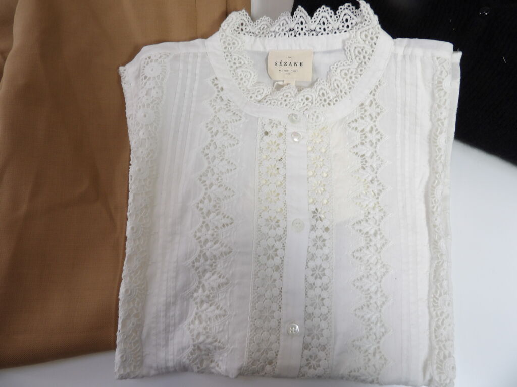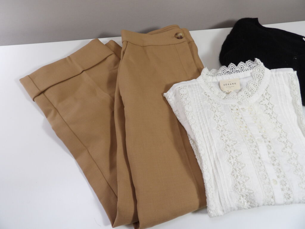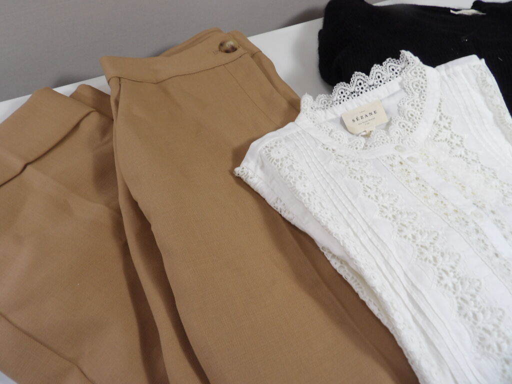 SEZANE x3 articles: Pantalon camel DAMON, Gilet BARRY noir et Chemise RYM ecru, en taille 40/L.