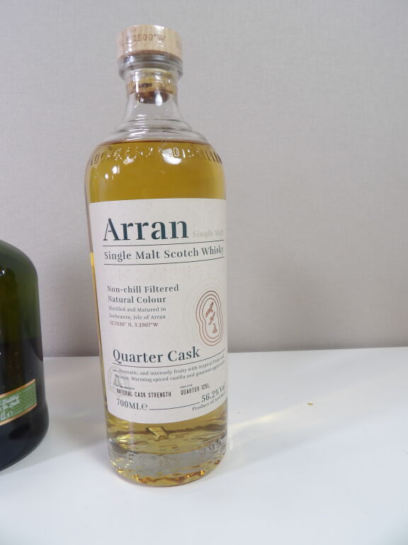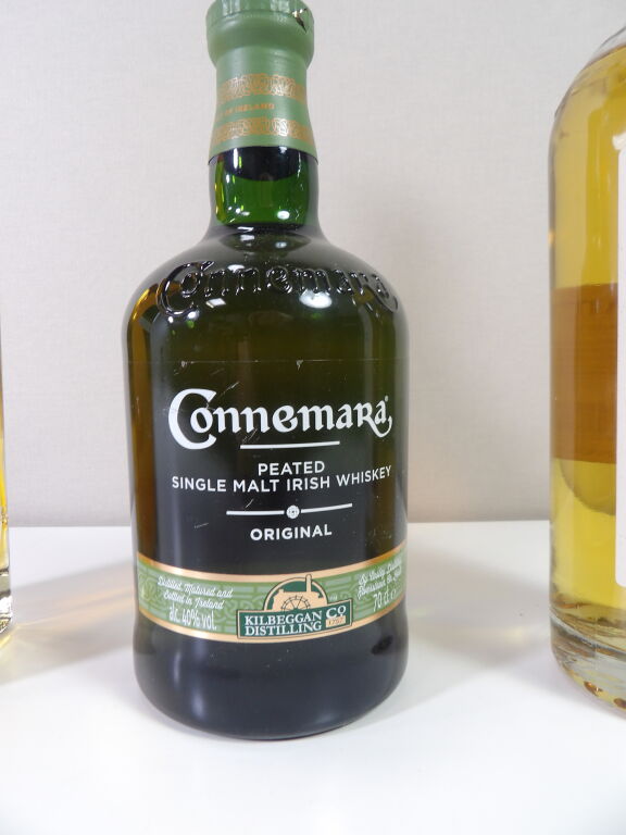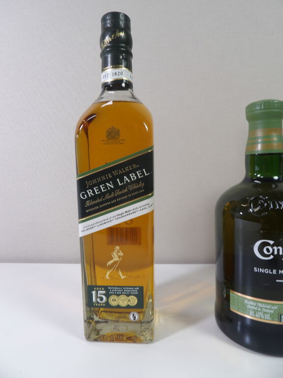 Spiritueux : 3 bouteilles ( 70 cl) dont un whisky Jonnie Walker green label, un whikey Connemara et un whisky Arran.