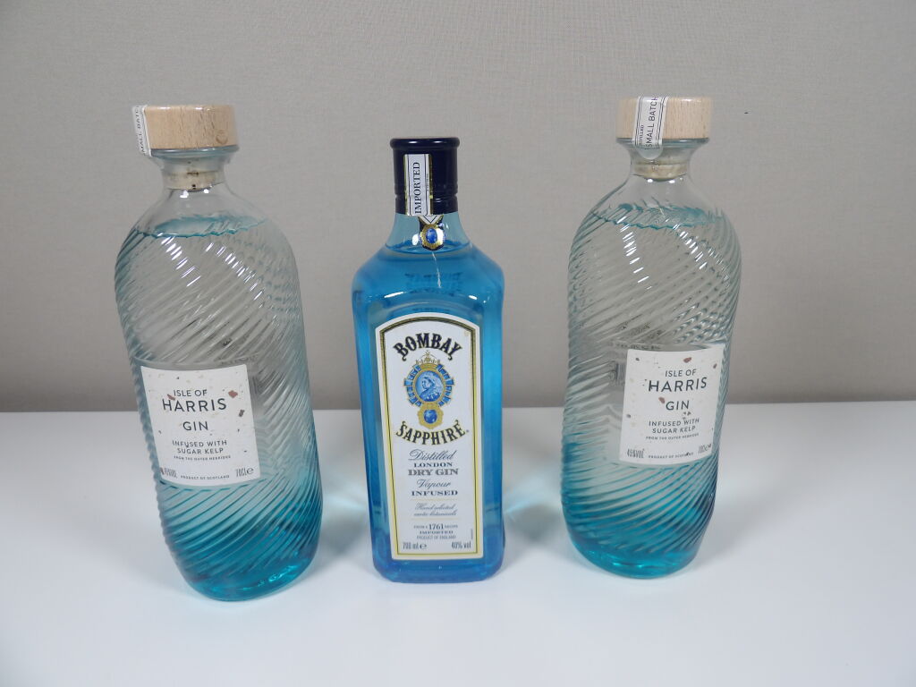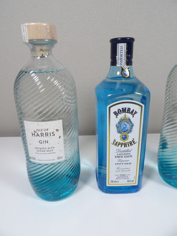 Spiritueux : 3 bouteilles de gin (70 cl) 1 Bombay Sapphire, 2 x Isle of Harris