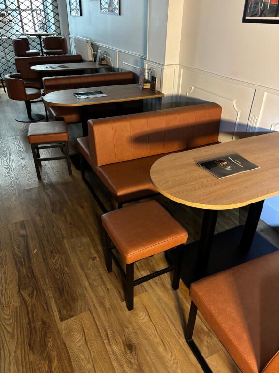 Lot de 8 banquettes en cuir à piètement en métal en 120cm, lot de 4 banquettes doubles en cuir à piètement en métal, lot de 4 tabourets hauts et de 10 chaises hautes enveloppantes en cuir à piètement en métal, lot de 12 chaises basses enveloppantes en cui