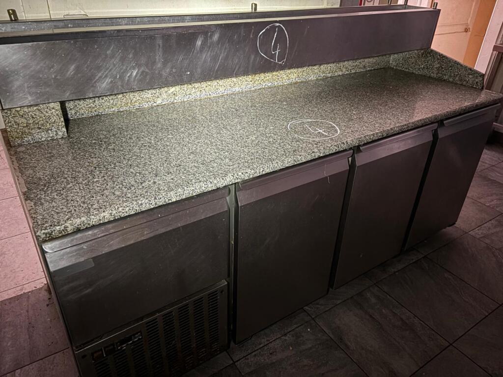 Meuble saladette 3 portes froid positif et dessus pierre marbrière. Dim. 215x70cm (vendu en live et sur désignation)