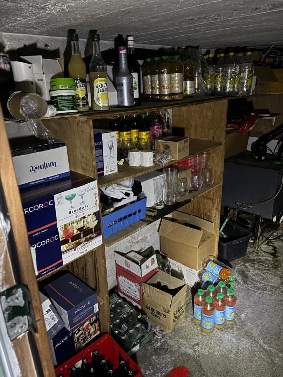 - Lot comptoir mélaminé/verre, vitrine en verre, lot de 6 meubles étagères en mélaminé noir, table en mélaminé, lot de 3 meubles en novopan artisanaux, vieux canapé 2 places en skaï, 15m linéaires environ d'étagères en m