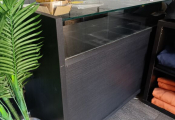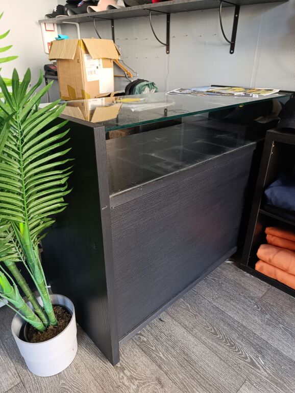 - Lot comptoir mélaminé/verre, vitrine en verre, lot de 6 meubles étagères en mélaminé noir, table en mélaminé, lot de 3 meubles en novopan artisanaux, vieux canapé 2 places en skaï, 15m linéaires environ d'étagères en mélaminé et barres portants de vêtements et 6 bustes en plastique