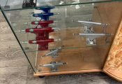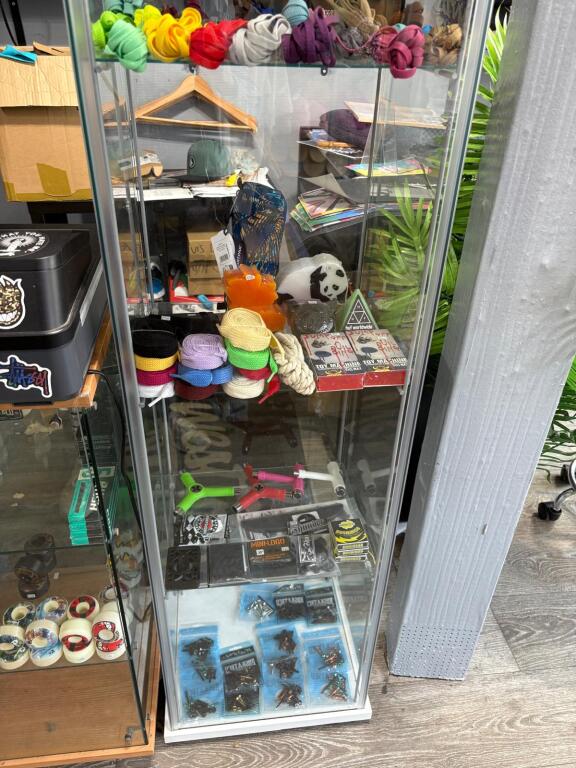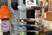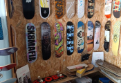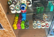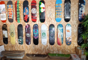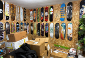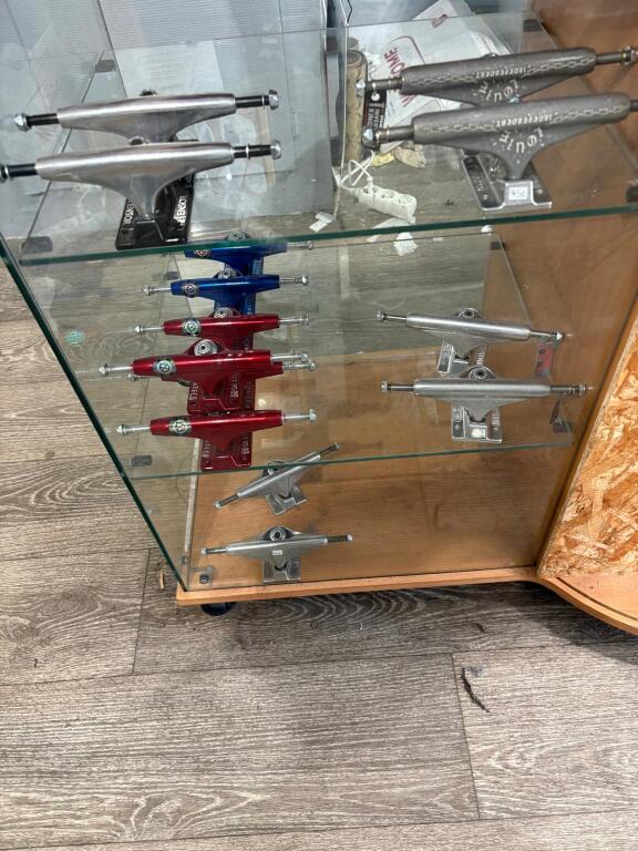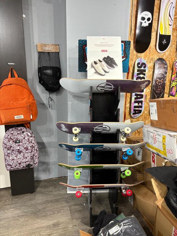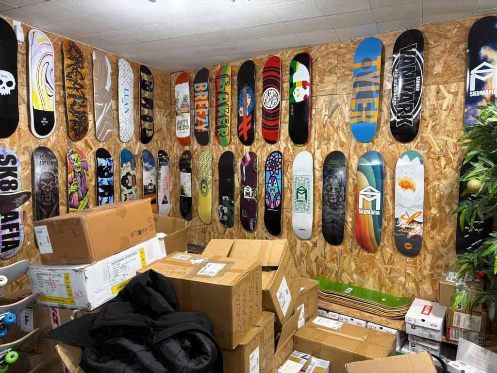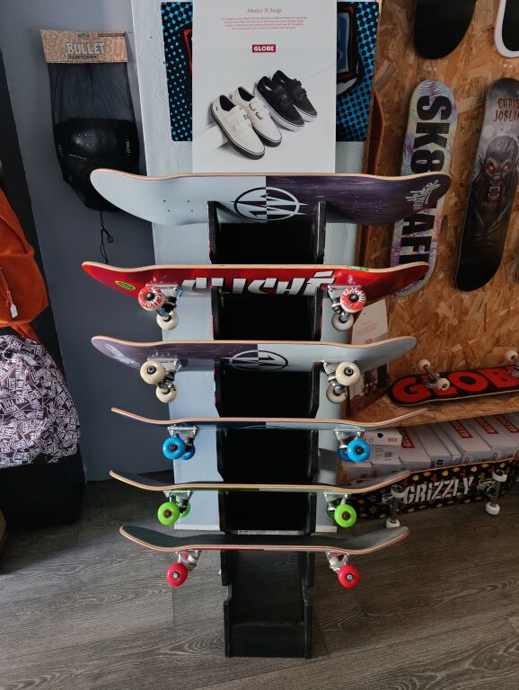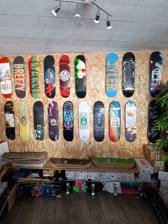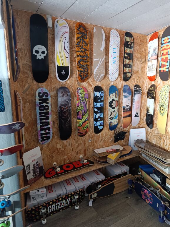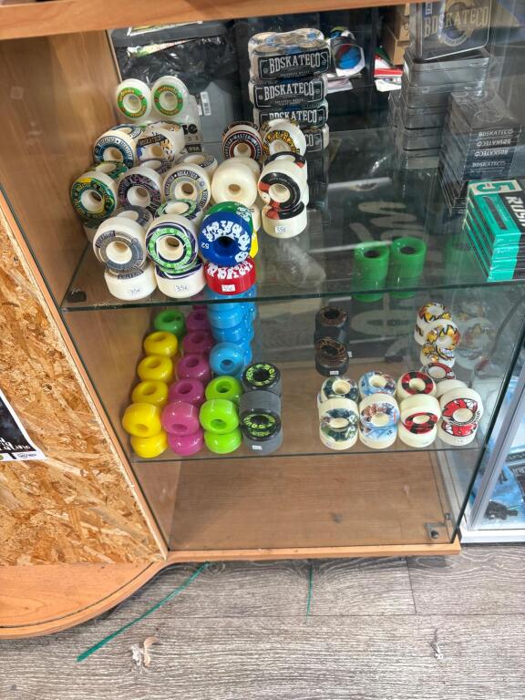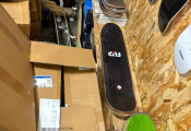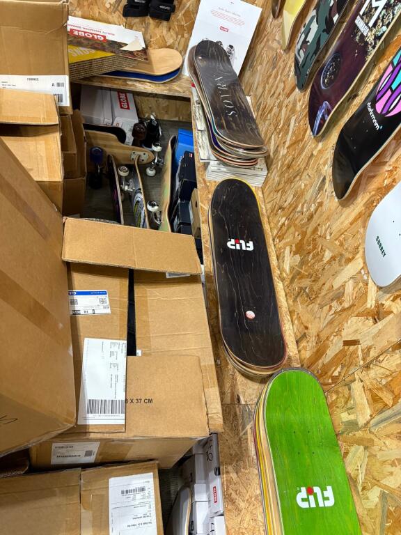 Lot d'accessoires de planches de skate board dont 30 roues environ, 21 roulement, 14 trucks, 15 grips environ, lot de 10 planches V-completes de skate board et 3 planches de long board, lot 60 planches nues de skate board (vendu en live et sur désignation)