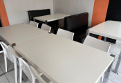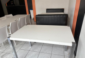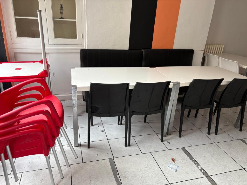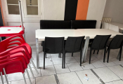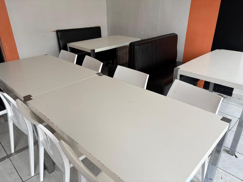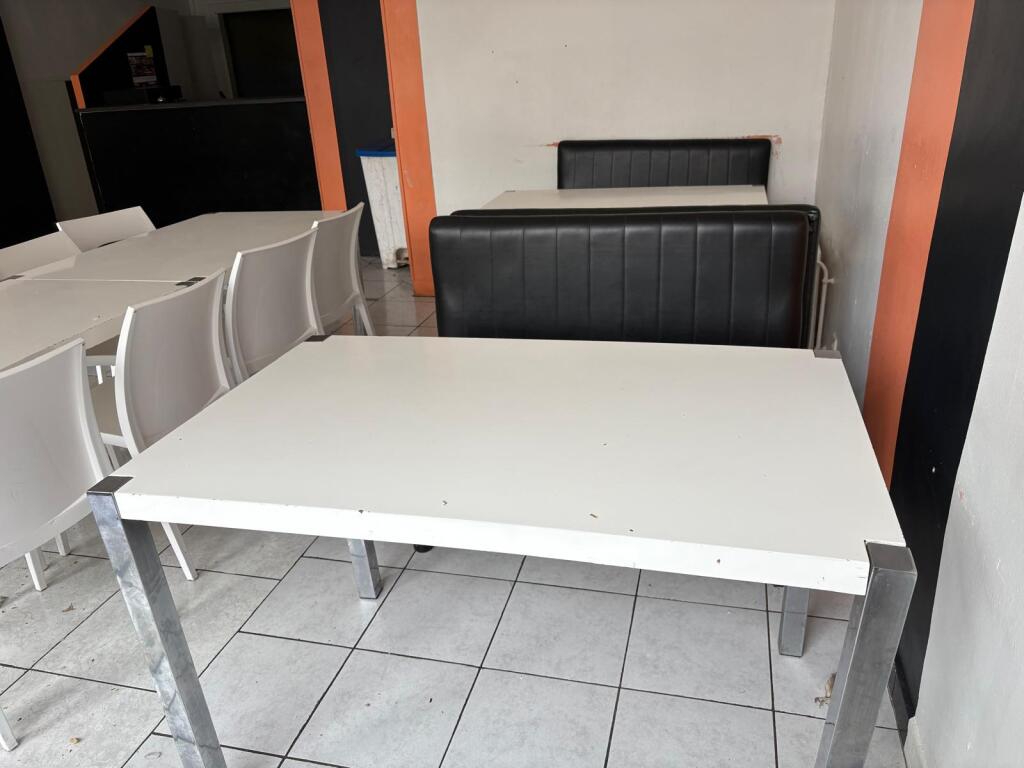 Lot de 5 banquettes skaï, lot de 7 tables en mélaminé usagées, lot de 14 chaises plastique blanches/noires, lot de 4 chaises plastique rouges et lot de 4 tables assorties (vendu en live et sur désignation)