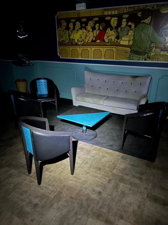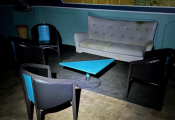 - Lot banquette à 3 places en tissu usagée, table basse, lot de 4 fauteuils en skaï usagés