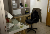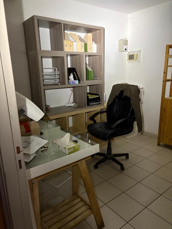 - Lot de mobiliers de bureau anciens dont étagère en mélaminé et bureau sur tréteaux et fauteuil en cuir usagé