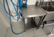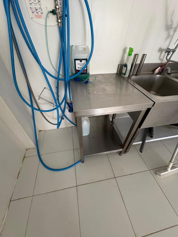 Lot de 3 tables de travail en inox dont 2 dim. 70x65cm et une 120x170cm et billot en bois