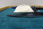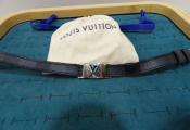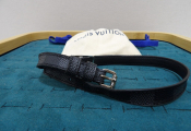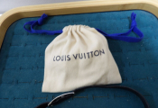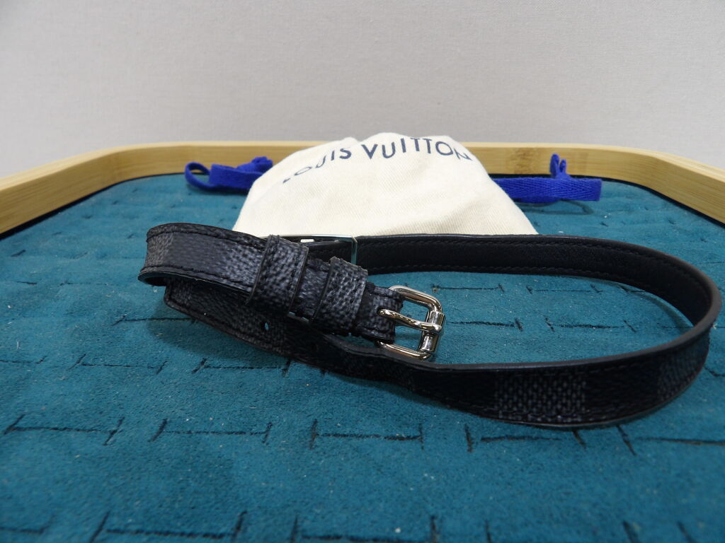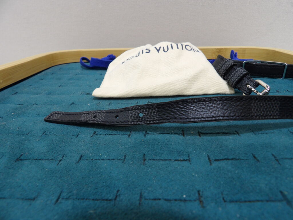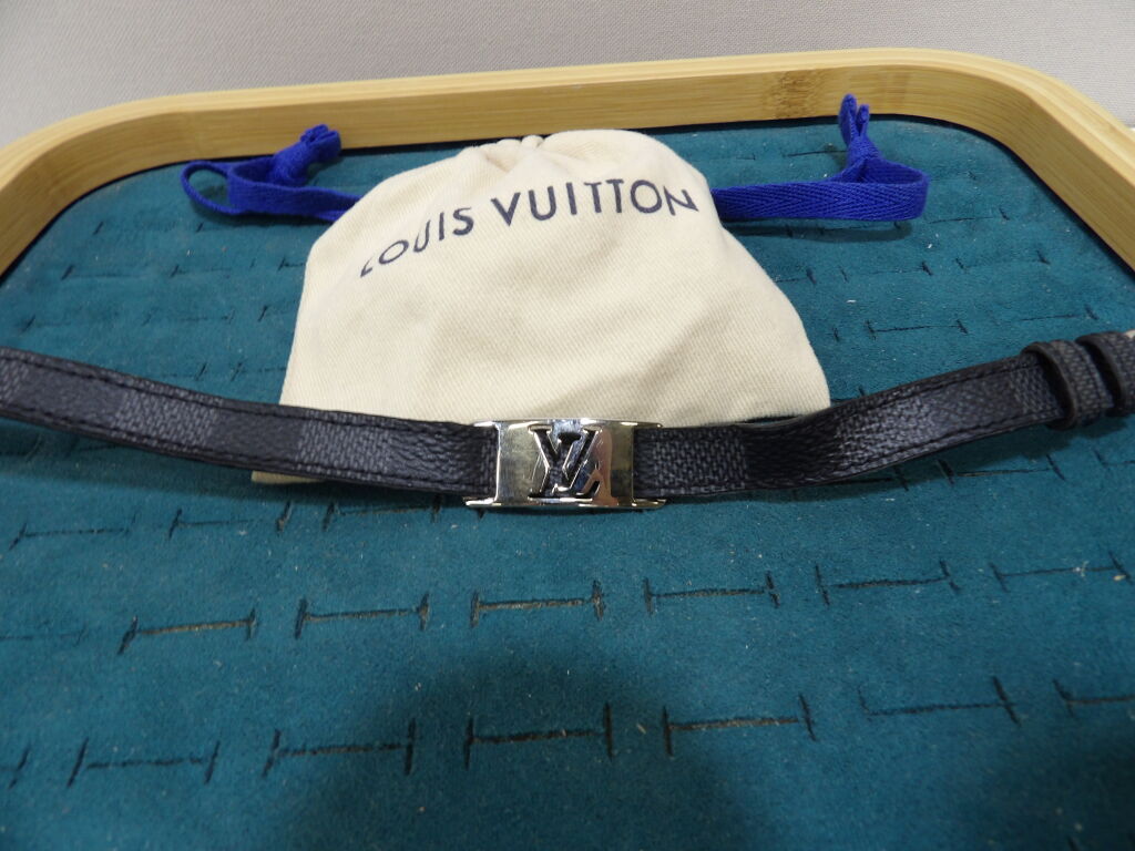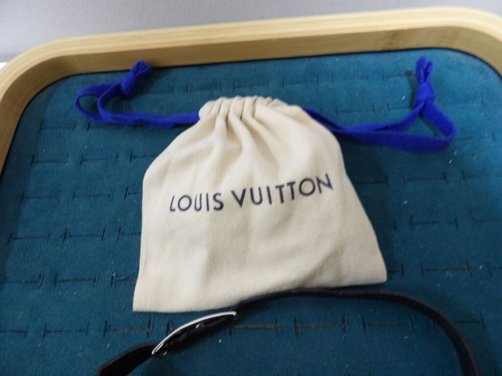 Louis Vuitton : bracelet double en cuir et métal argenté, modèle Sign It, état d'usage, déformations, rayures et un pochon de la marque ...
