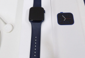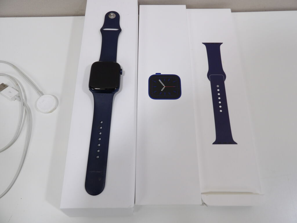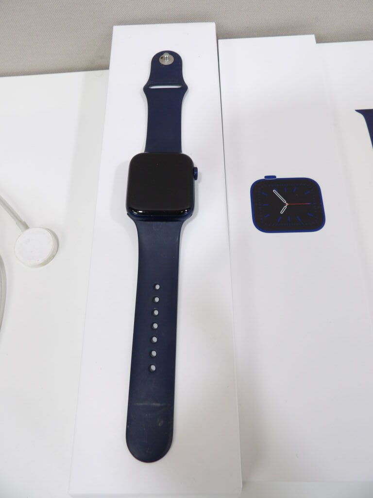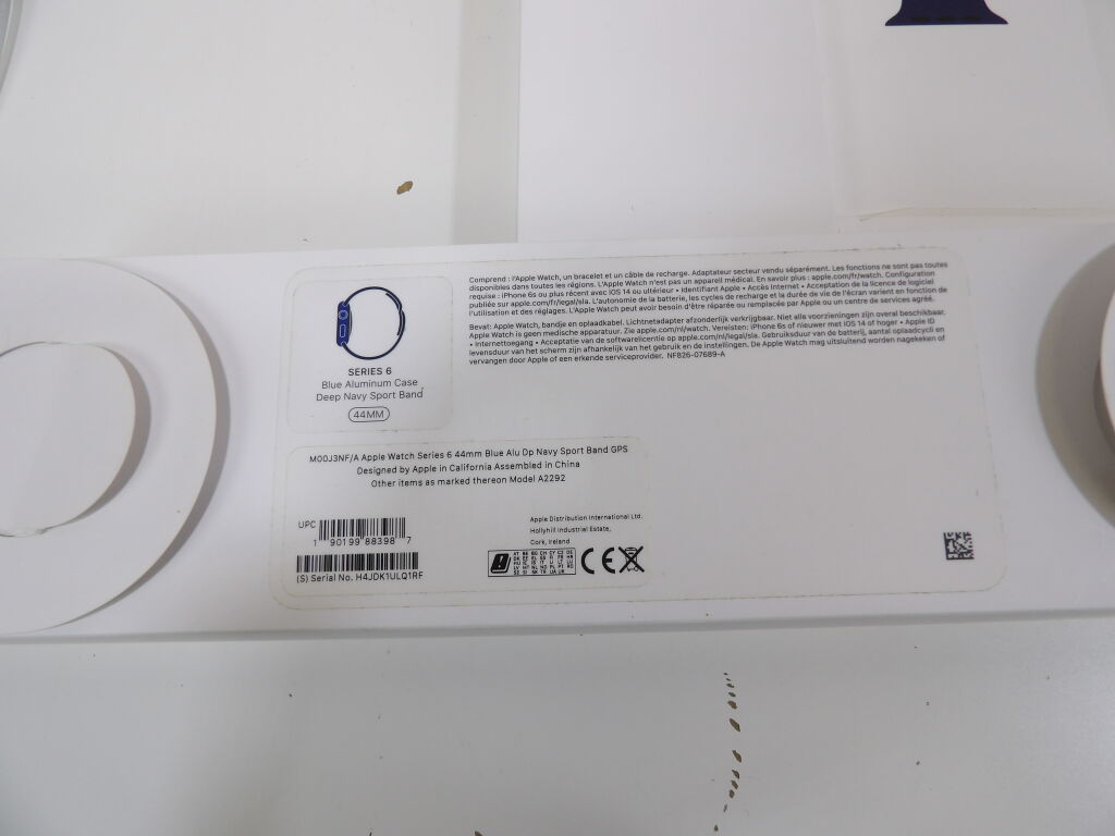 Montre connectée Apple Watch série 6, blue aluminium, 44 mm, occasion non testée avec chargeur et boîte.