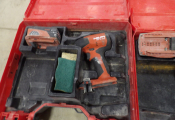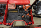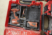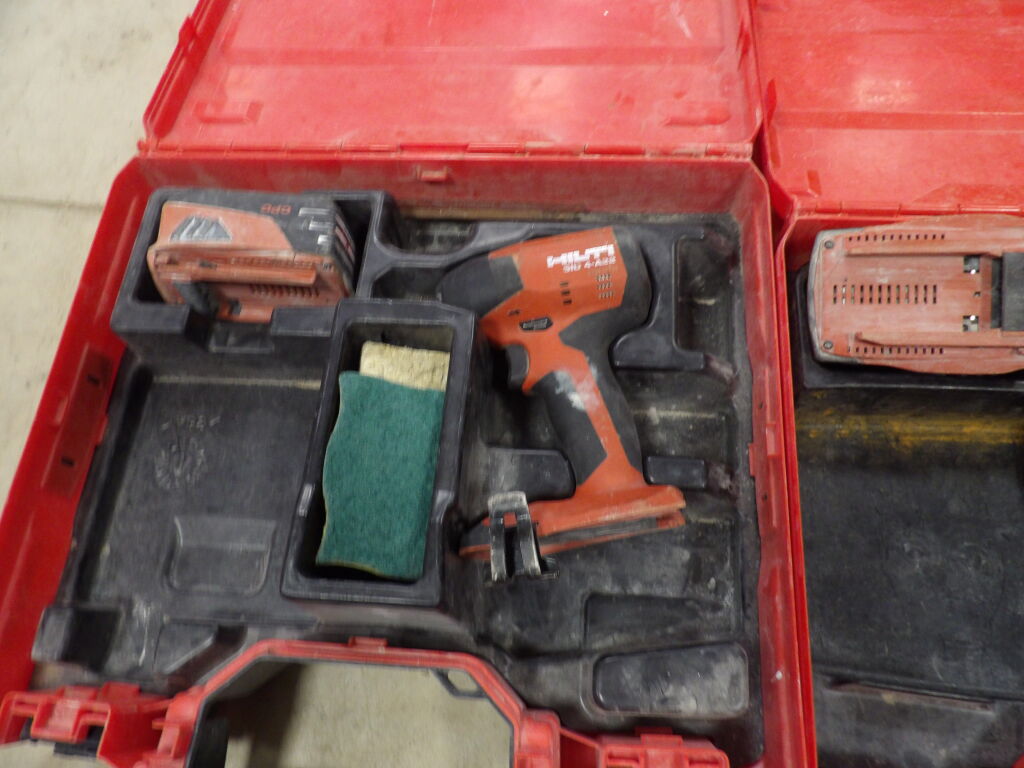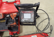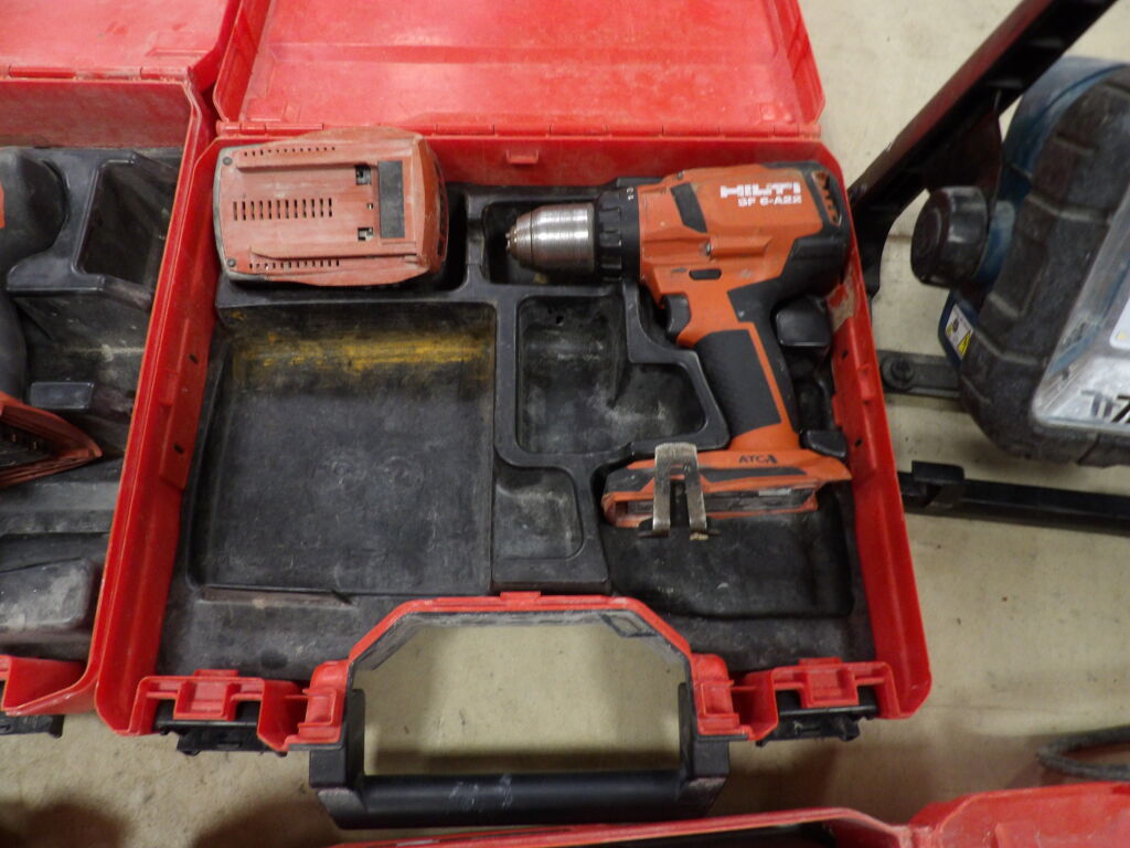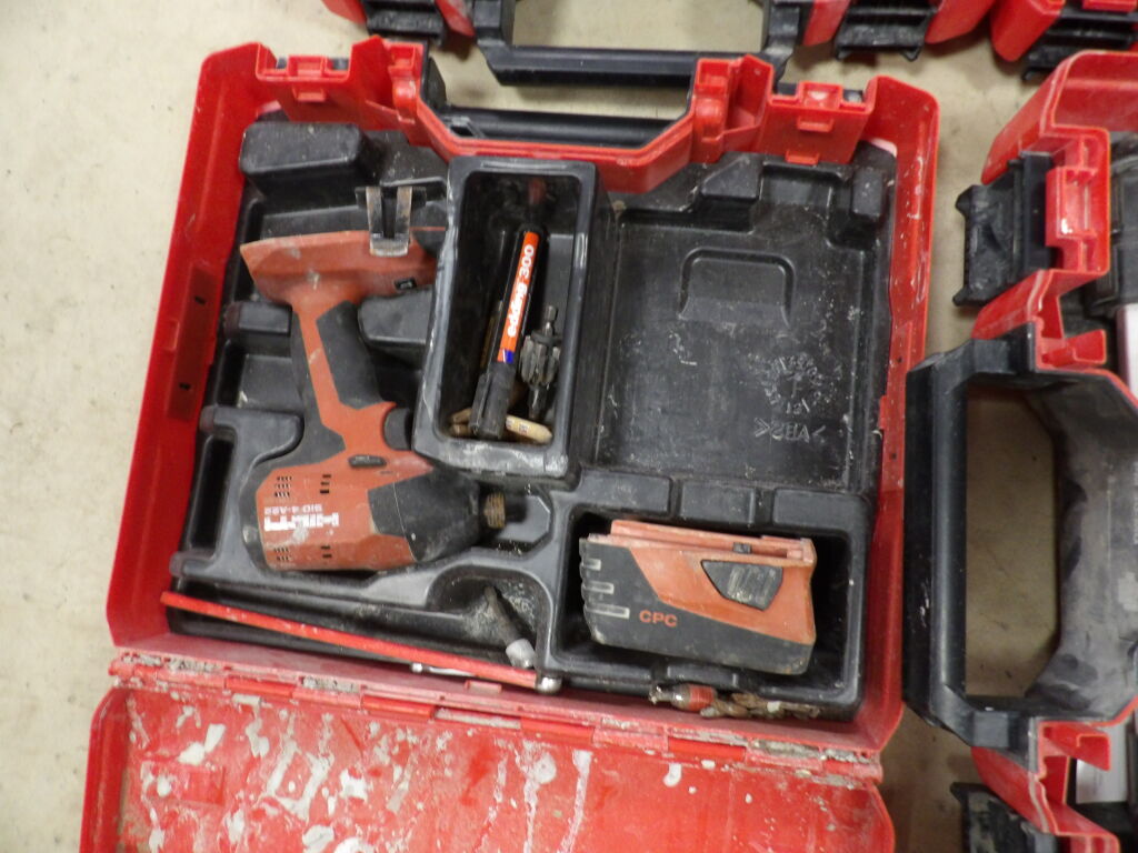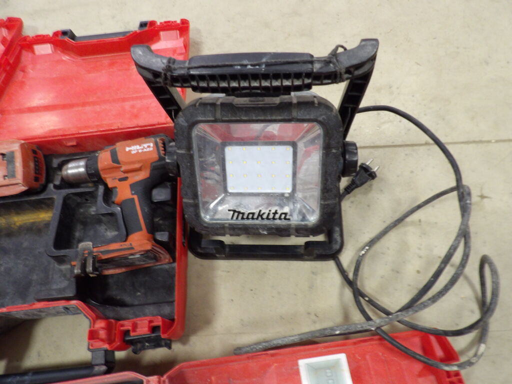 Outillage Hilti : 4 mallettes dont une visseuse sans fil, 2 clés à choc, un niveau laser, on y une lampe de chantier Makita DML805, le tout non testé et vendu en l'état.
