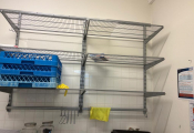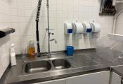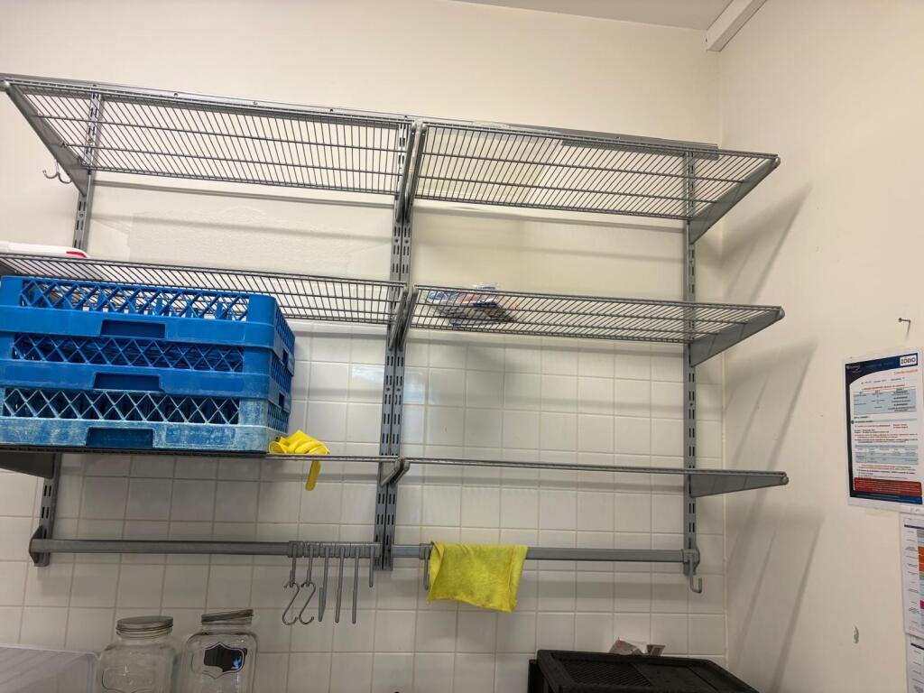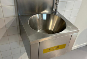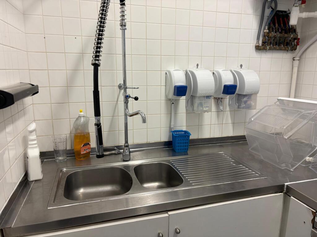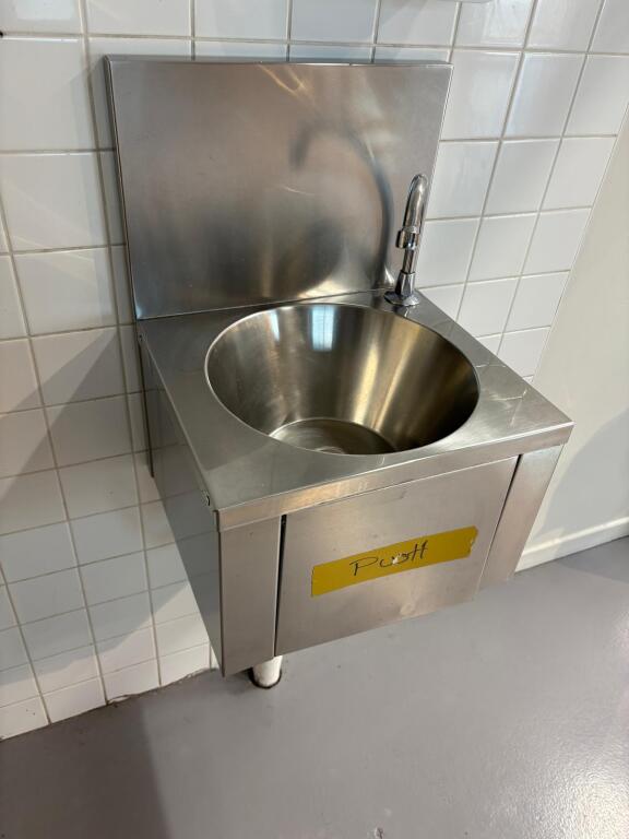 Lave-vaisselle SAMMIC environ 13 ans, plonge à 2 bacs avec douchette, lot de 10 étagères alu et lave-main inox (Vendu sur désignation)