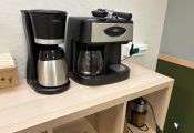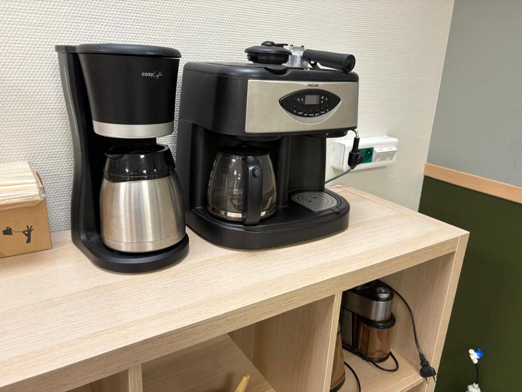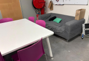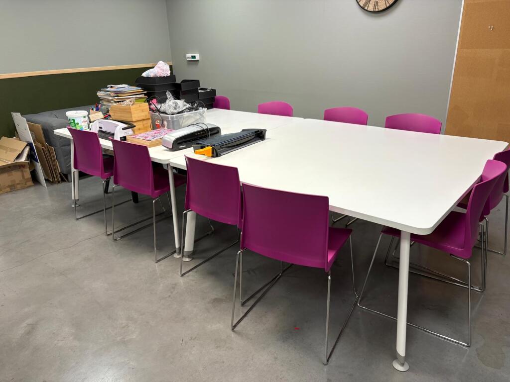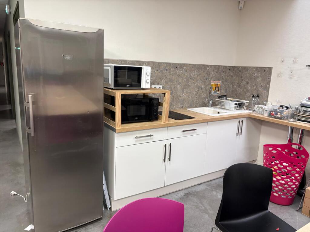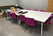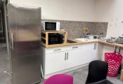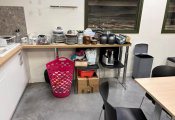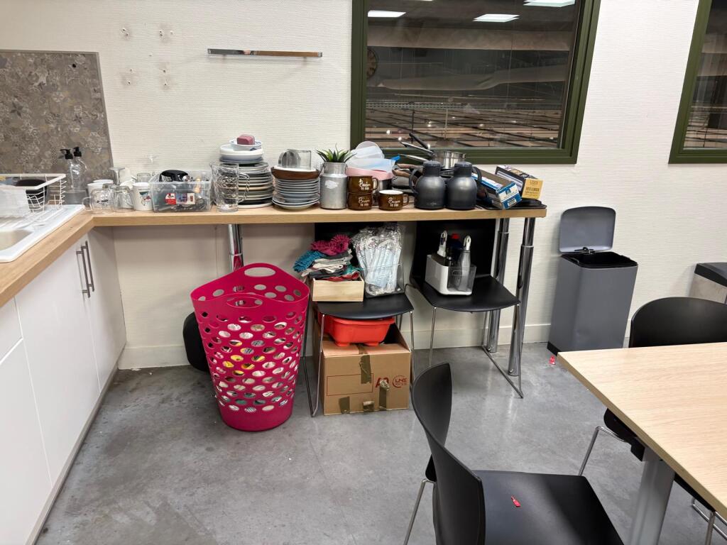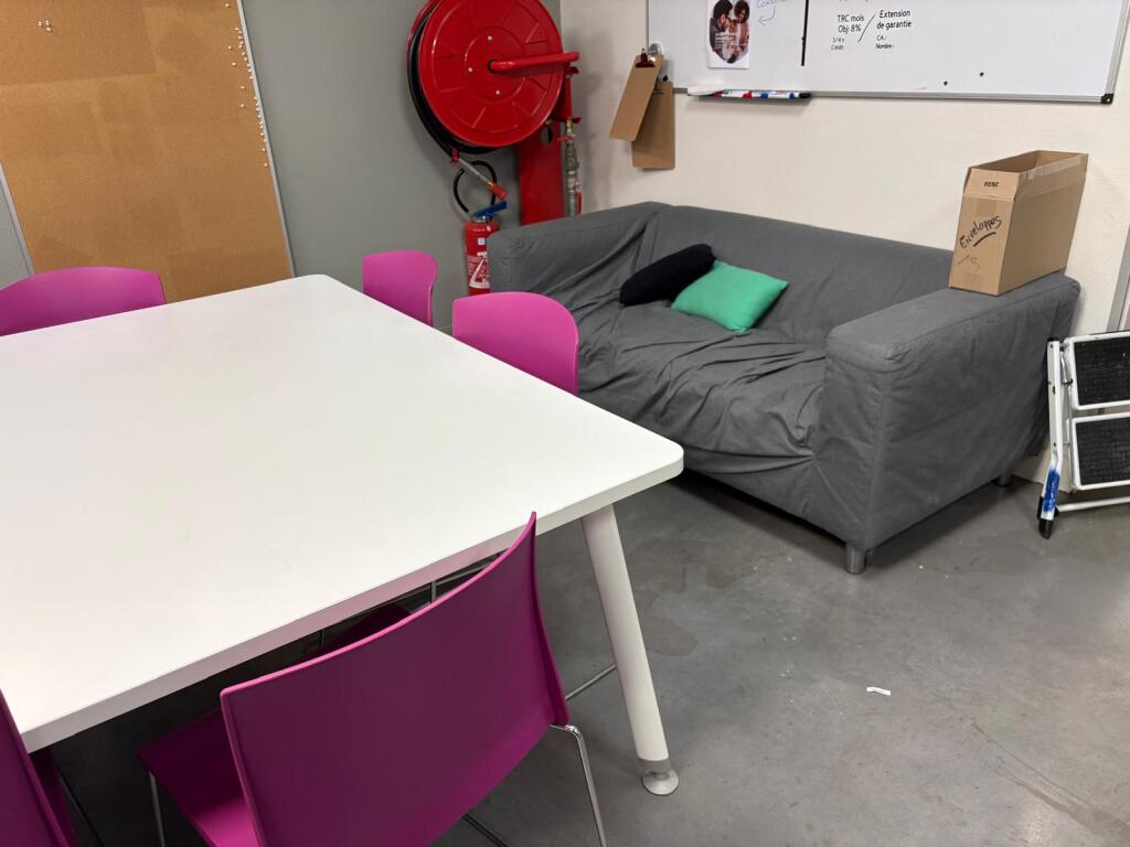 Lot cantine mélaminé 5 tables 70x140 et 2 autres 162x160 en mélaminé, 2 canapés tissus usagés, 30 chaises plastique, casiers mélaminé, 2 micro-ondes BEKO, frigo Hotpoint, 2 machines à café et divers... (Vendu sur désignation)