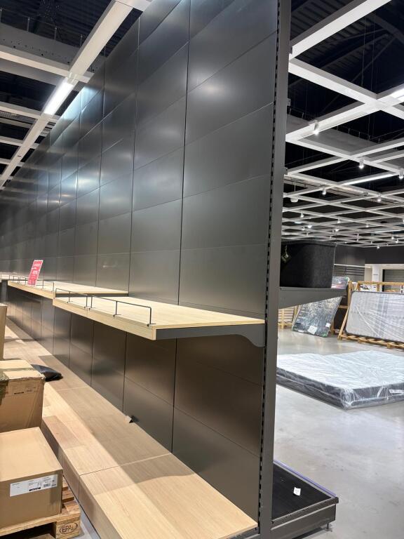 Lot de 161 gondoles métal en double en panneaux de 99cm large et 68 gondoles en panneaux simple en 99cm large avec étagères diverses (Vendu sur désignation)
