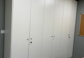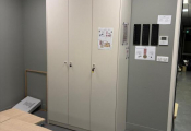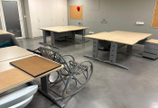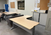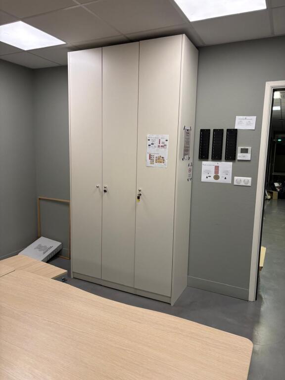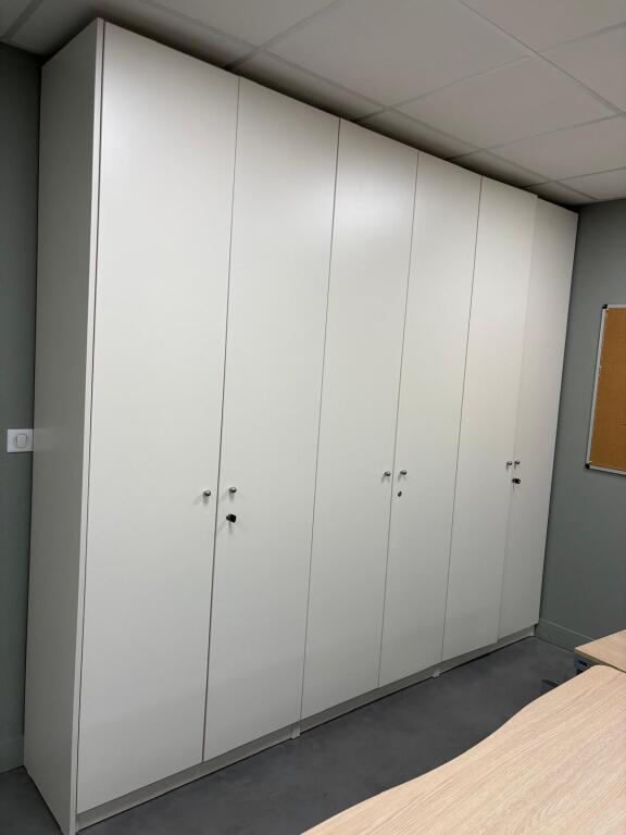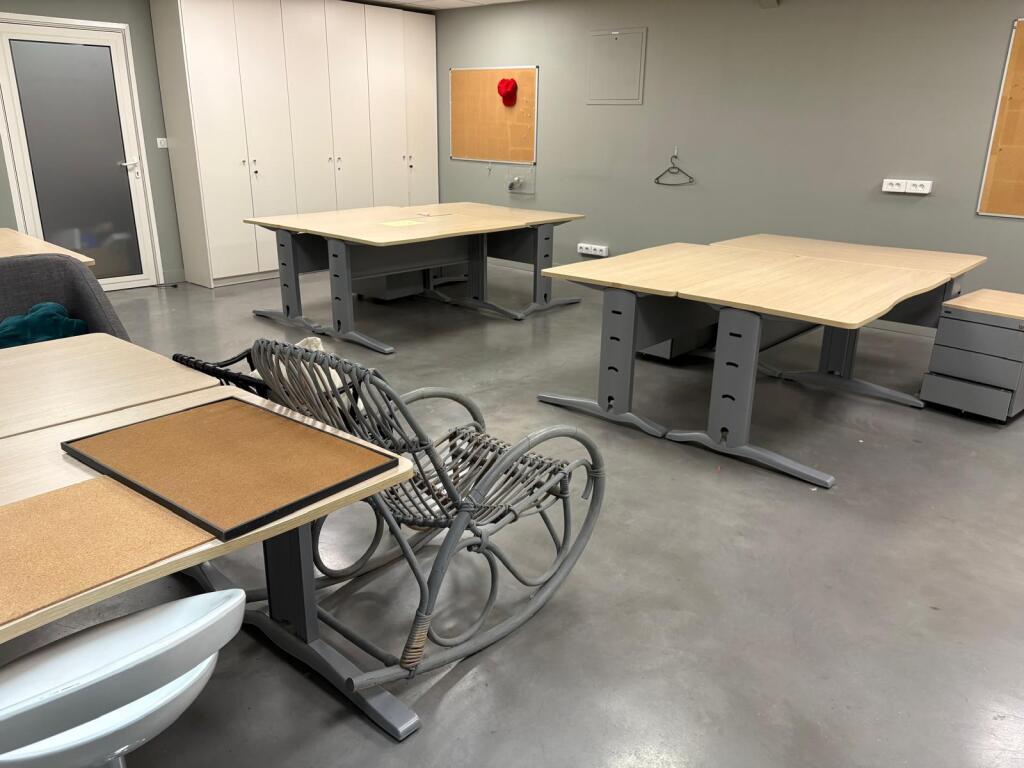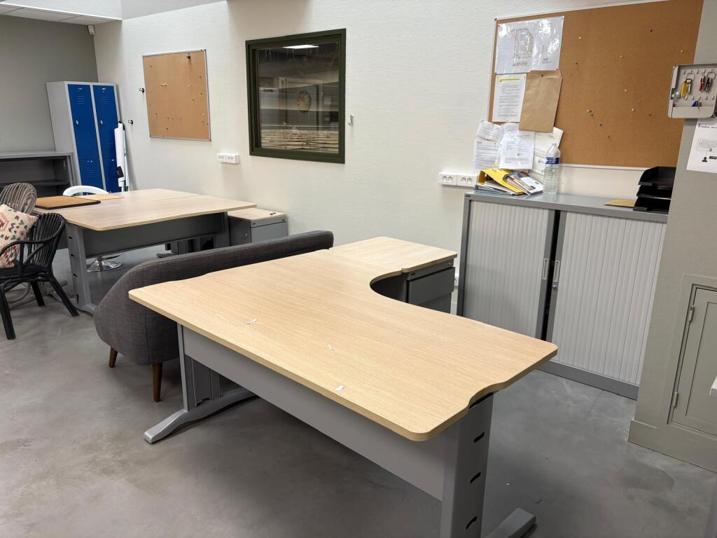 Lot de 8 tables et bureau mélaminé, 7 caissons, 4 blocs armoire mélaminé, 2 meubles classeur bois métal MAJENCIA, 4 vestiaires métal, canapé tissu, petite table et 2 sièges rotin (Vendu sur désignation)