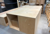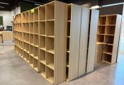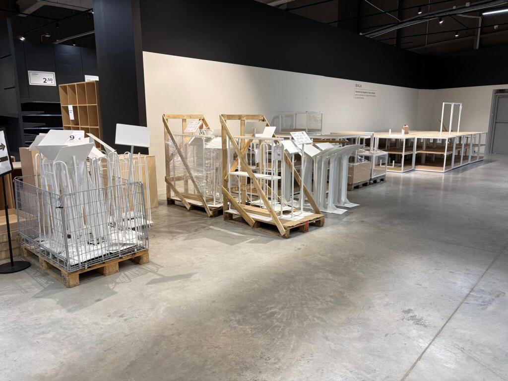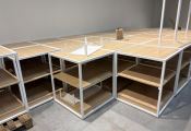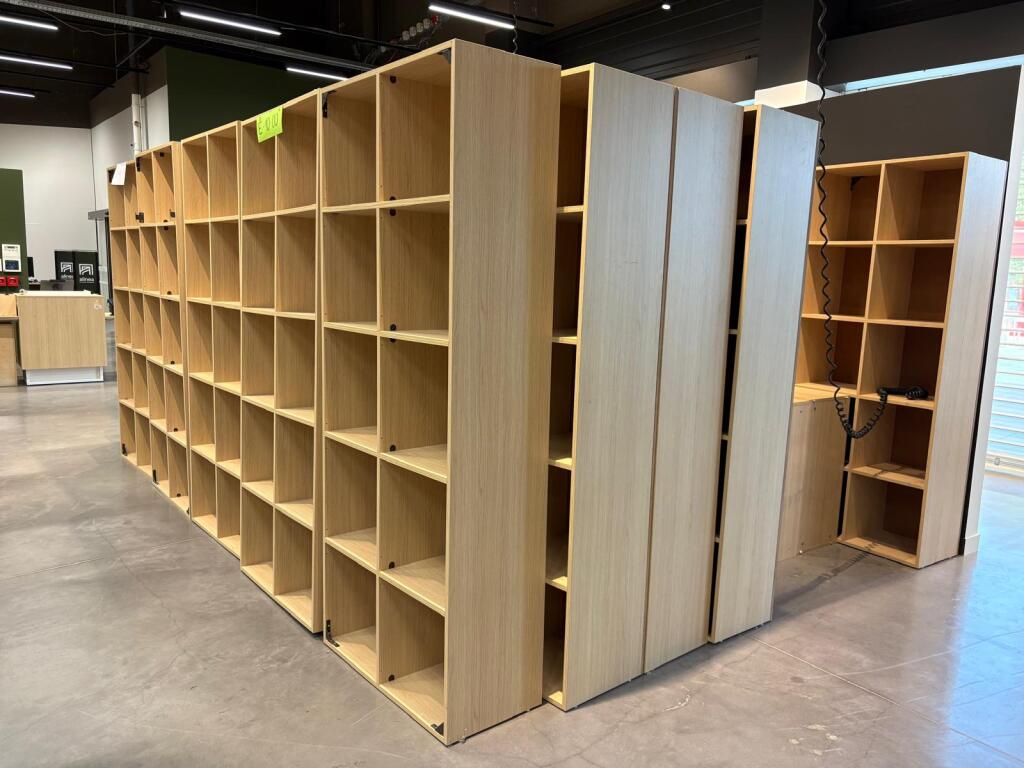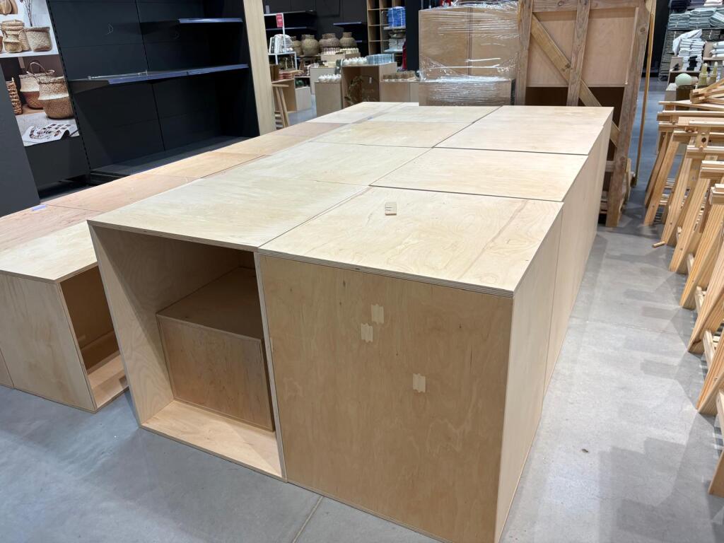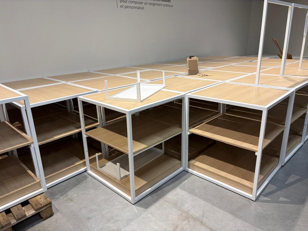Lot des meubles d'expo composés de meubles mélaminé métal 80x80cm et divers caissons et tables tréteaux présents dans tout le magasin (Vendu sur désignation)