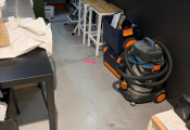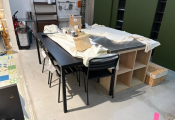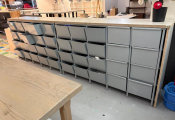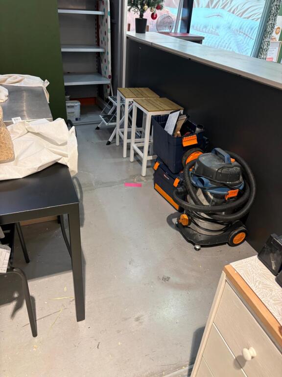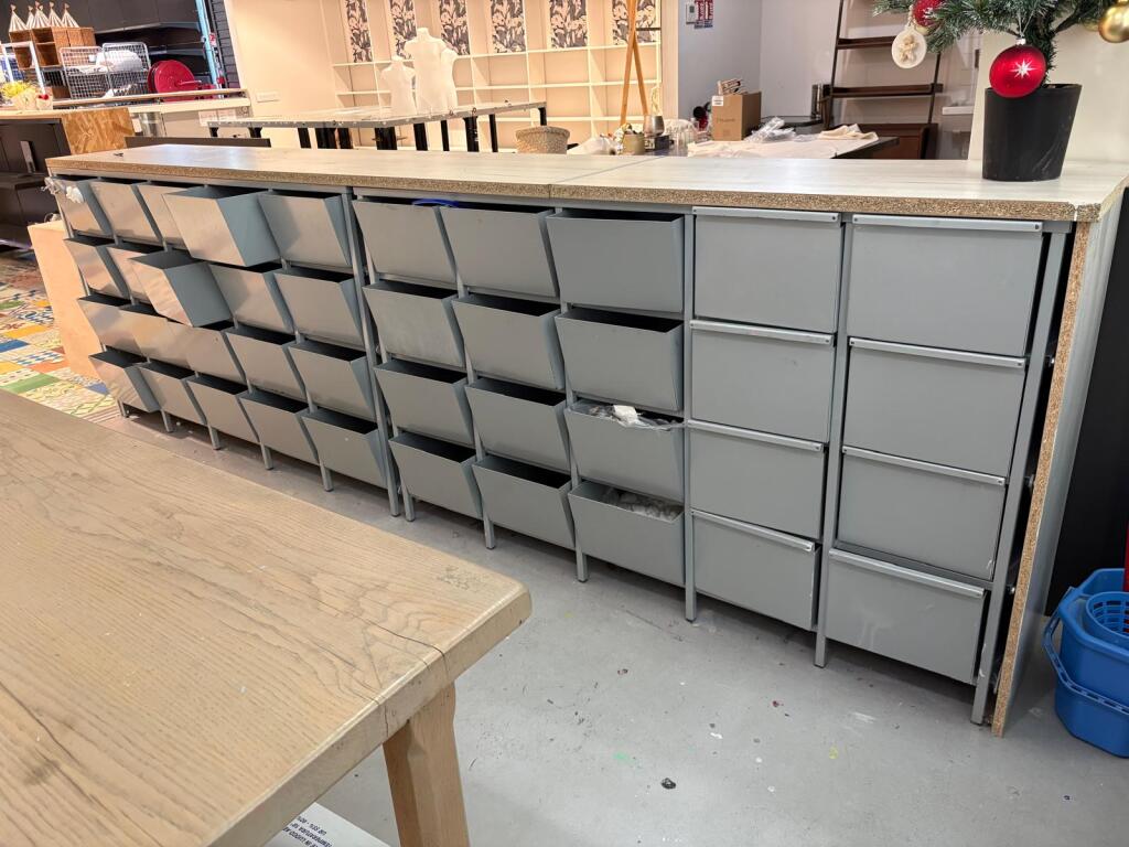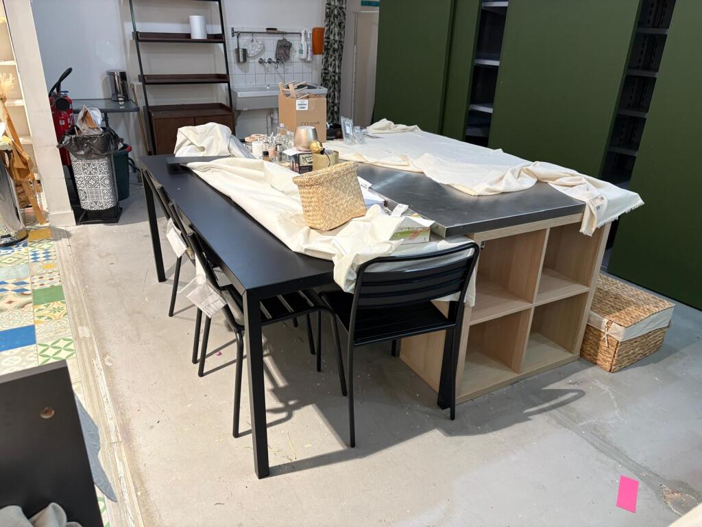 Lot fond d'atelier dont table en chêne, 2 meubles de rangements à casiers en 171x59xH105cm chacun, meuble mélaminé et 2 autres, table et 4 chaises métal, 4 tabourets bois, aspirateur bidon (Vendu sur désignation)