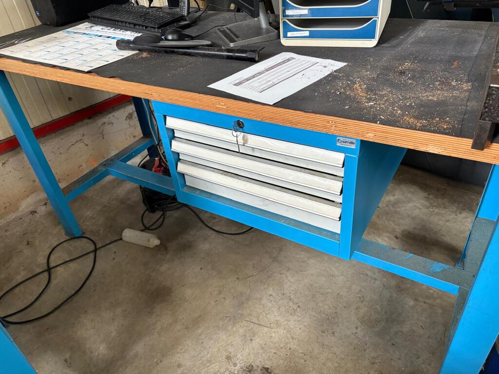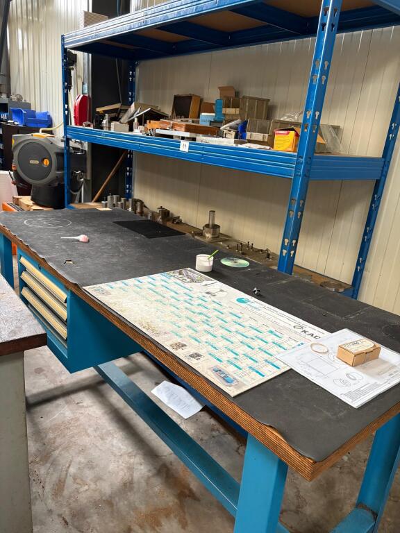 Lot 2 tables d'atelier métal/bois en 200cm SARALLE et racks métal/novopan à 4 hauteurs
