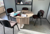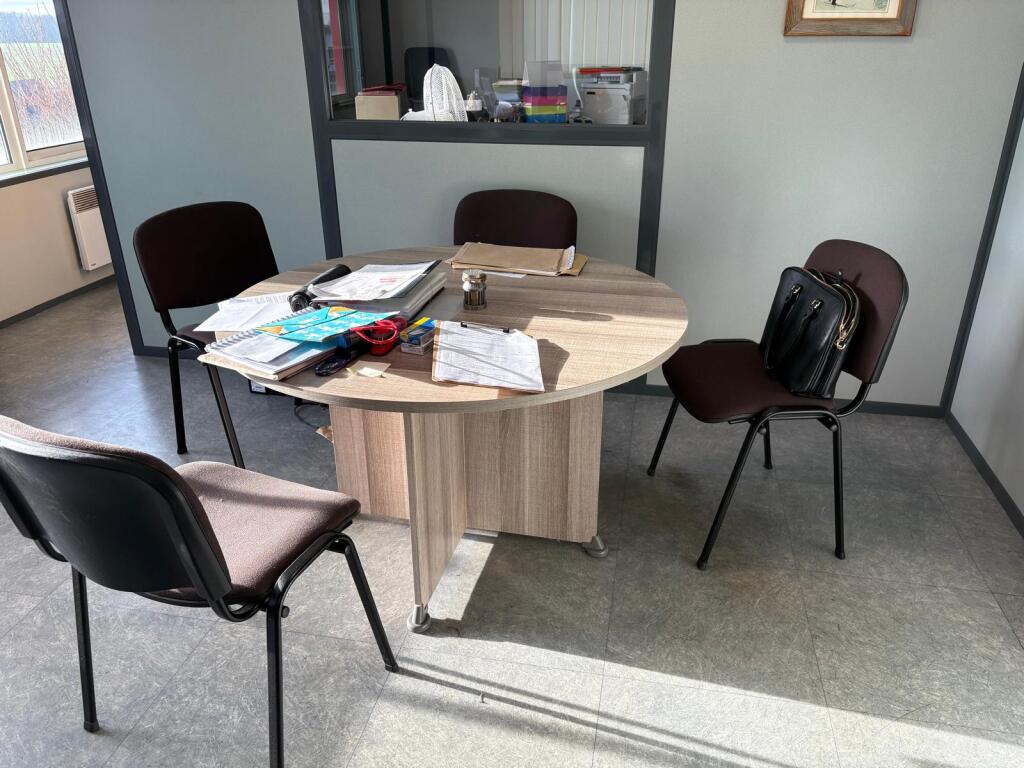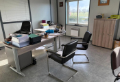 - Lot table mélaminé et 4 chaises tissu, bureau mélaminé avec retour et caisson, 2 meubles mélaminés de rangement, fauteuil à roulettes et 2 chaises métal/PVC