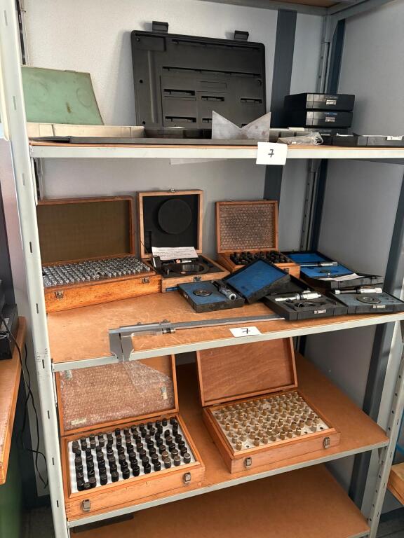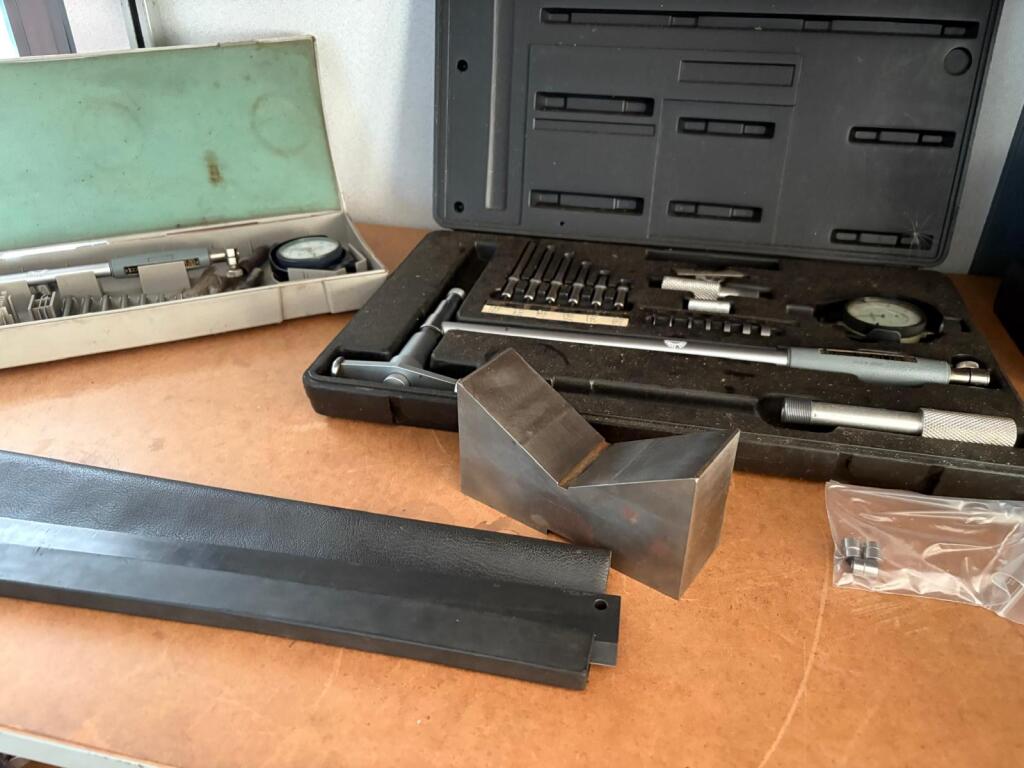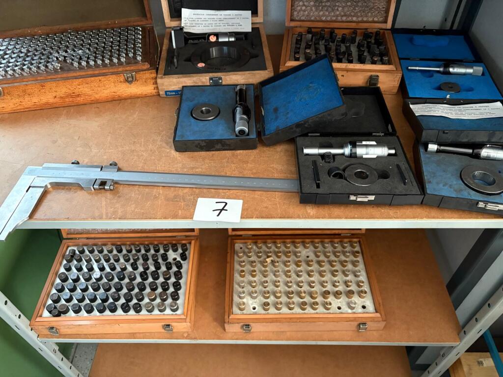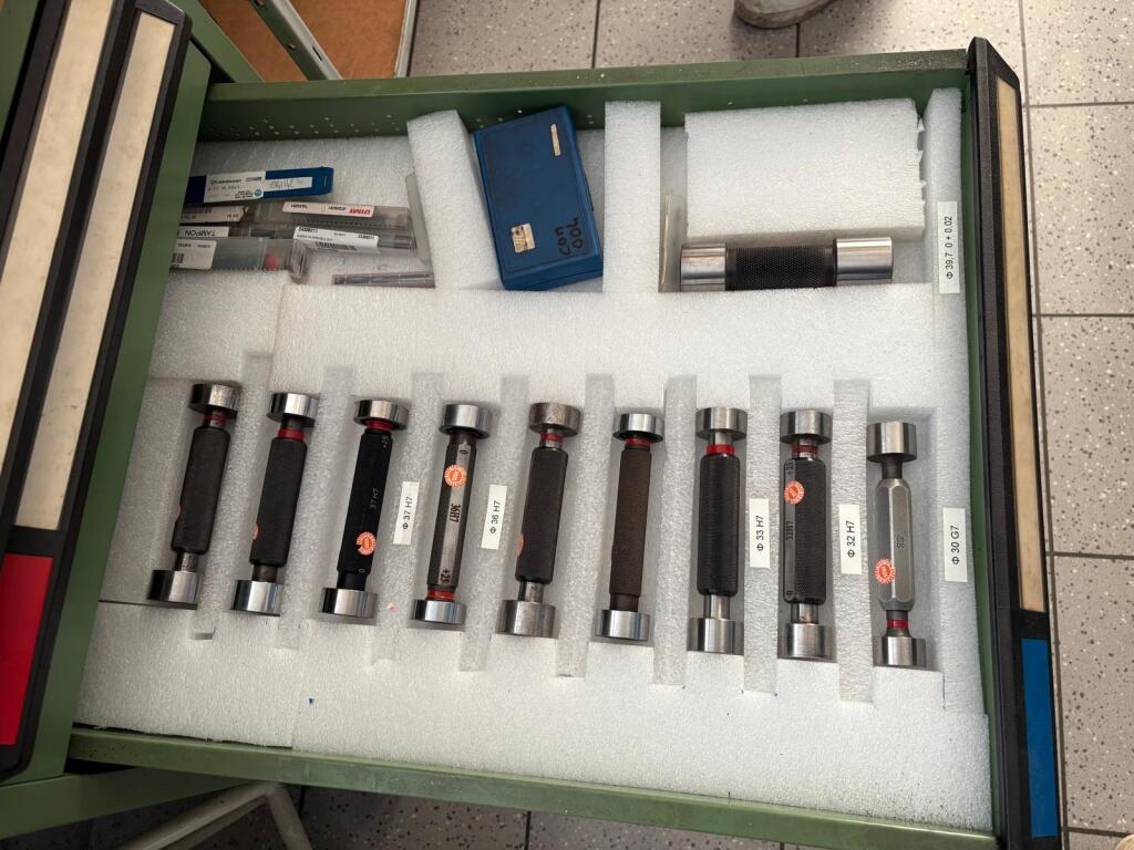 - Lot de tampons, métrologie et table atelier fer dessus bois, chariot roulant métal