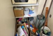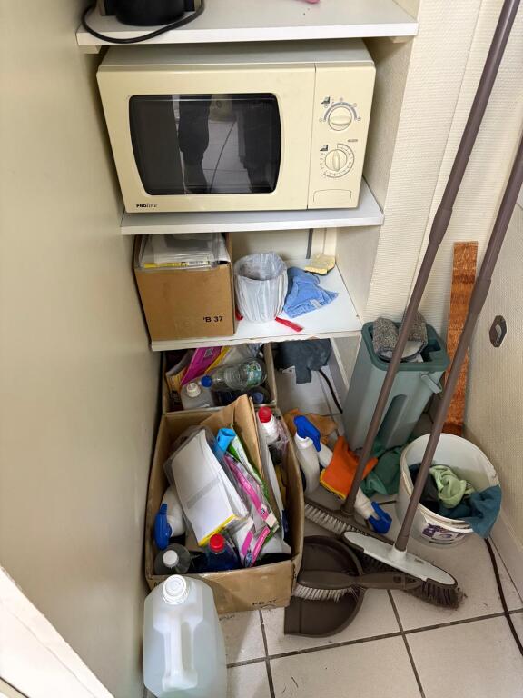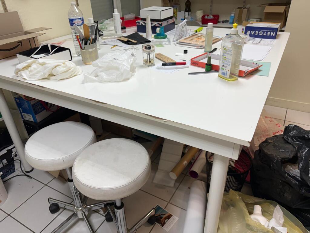 - Lot bureau en mélaminé avec caisson, chaise à roulettes, table carrée en mélaminé usagée, tabouret roulant, chaise en tissu, frigo table top, micro-onde PROLINE