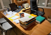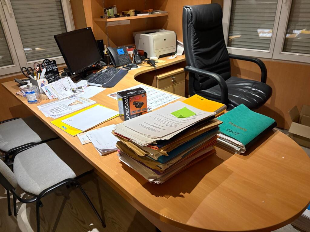 - Lot bureau en mélaminé avec retour et caisson, fauteuil pivotant en cuir, 2 chaises en tissu usagées, meuble classeur en métal
