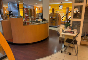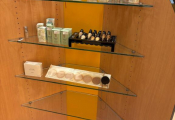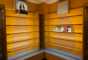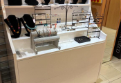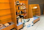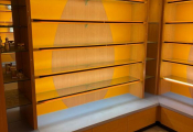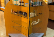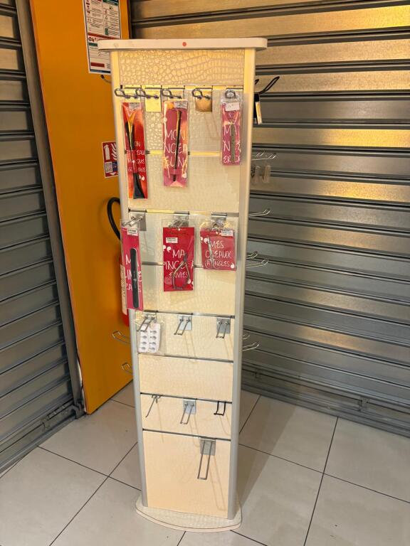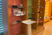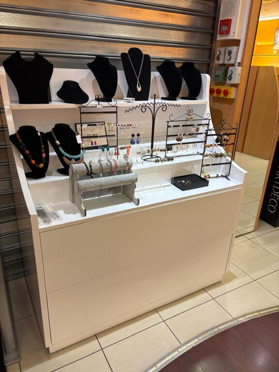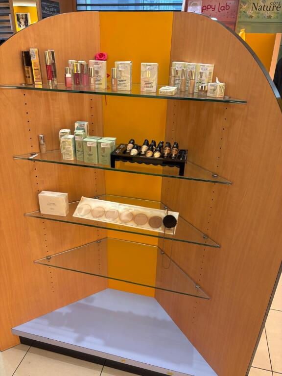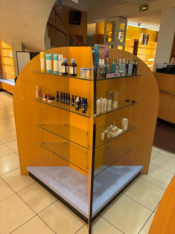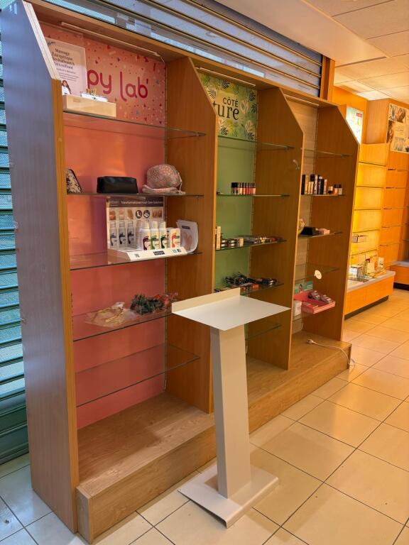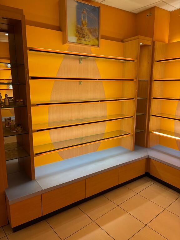 - Lot desk demi rond en mélaminé et verre formant présentoir, lot de meubles présentoir divers usagés en mélaminé dont 4 en 3,80m, 3 en 1,30m et autre à 4 faces, vitrine en bois à 6 hauteurs et 6 podiums, le restant des présentoirs est attachés aux murs et forme immeuble par destination