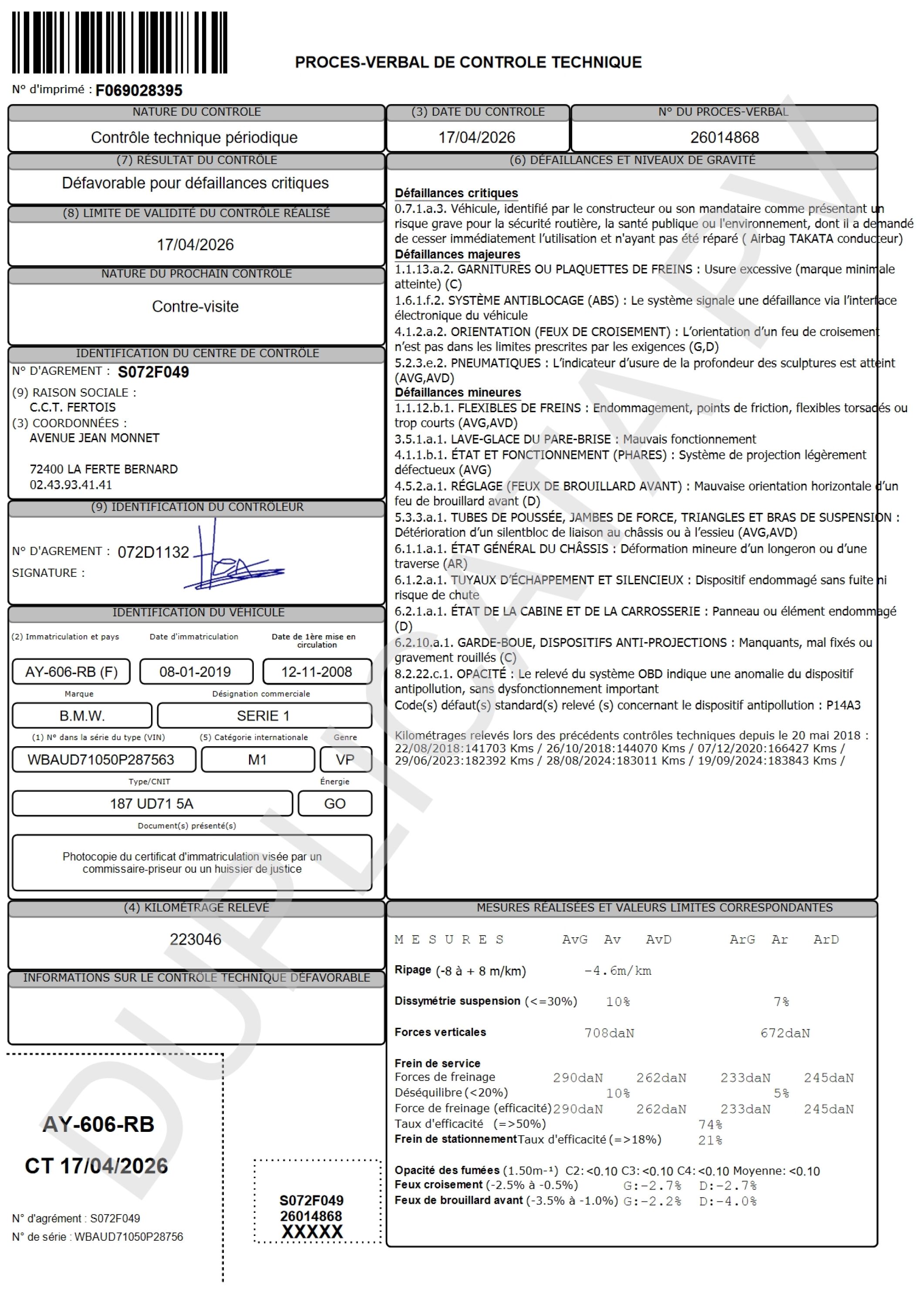 Observations : - ENLEVEMENT OBLIGATOIRE PAR PLATEAU CAR AIRBAG TAKATA