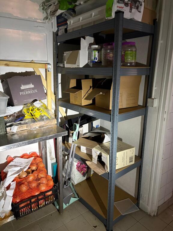 Lot de la réserve comprenant 2 tables en inox, Dim. 160x60cm avec dosseret et 2 petites étagères en métal/novopan (vendu sur désignation)