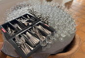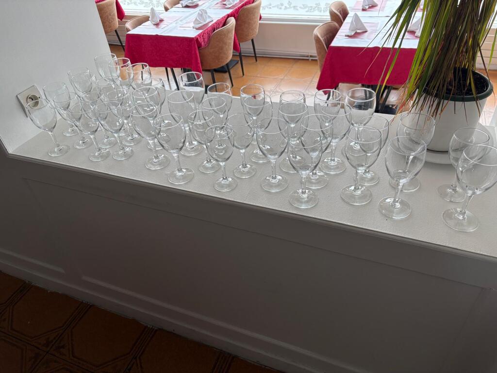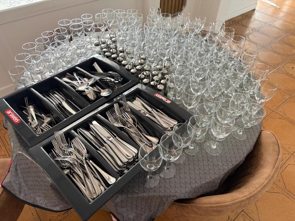 Lot de verres du restaurant, couverts en inox, poivrières et salières (vendu sur désignation)