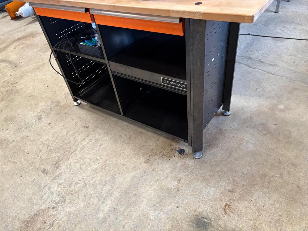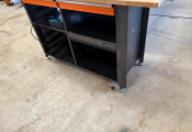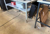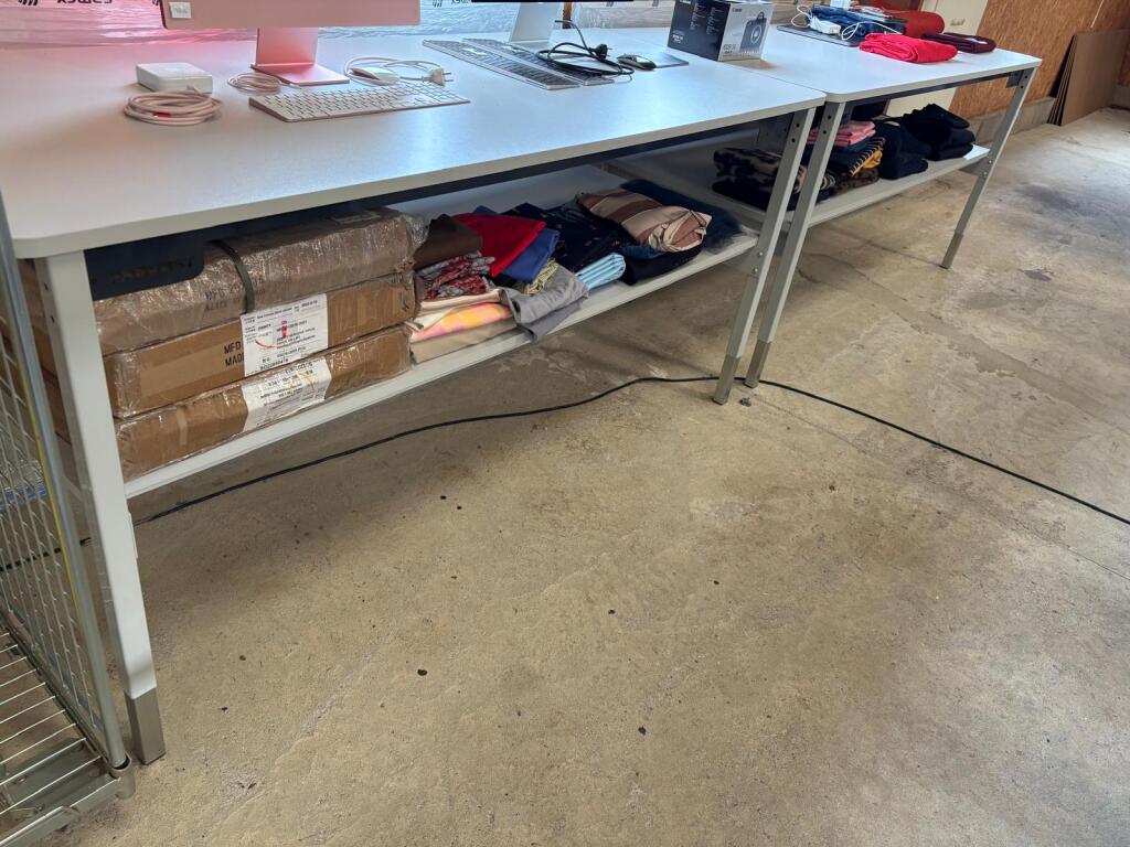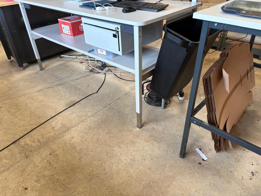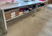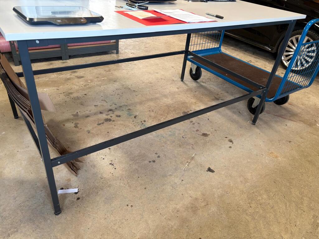 - Lot de 7 tables en mélaminé de travail diverses tailles et autre table de travail avec tiroir et gradin