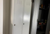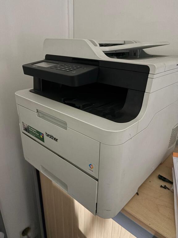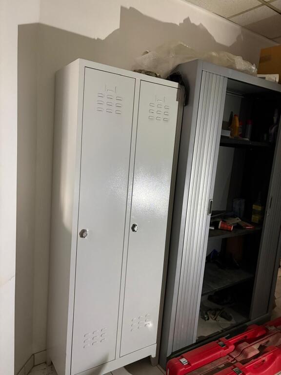 Lot bureau du chef d'atelier en mélaminé, 2 armoires et meuble bas métal, fauteuil et imprimante BROTHER