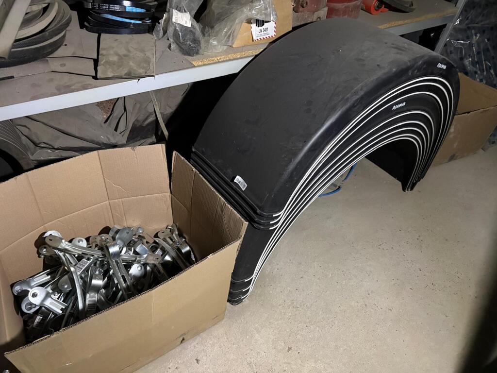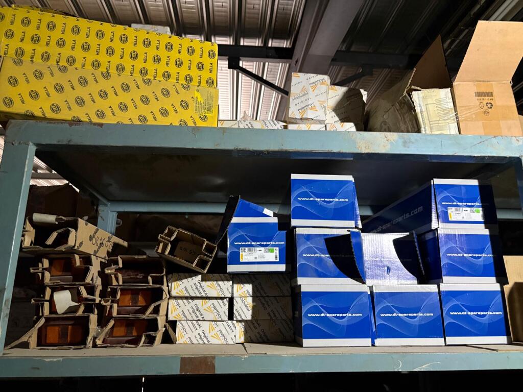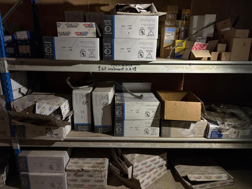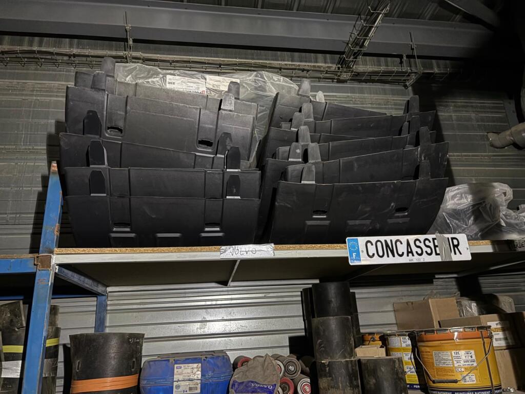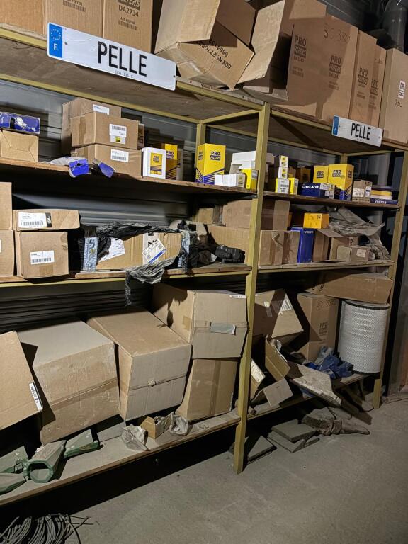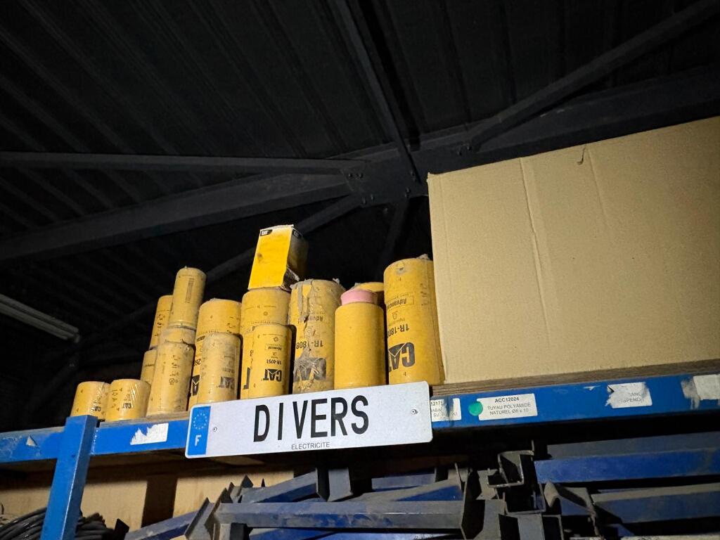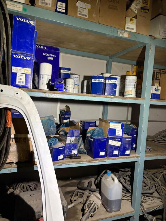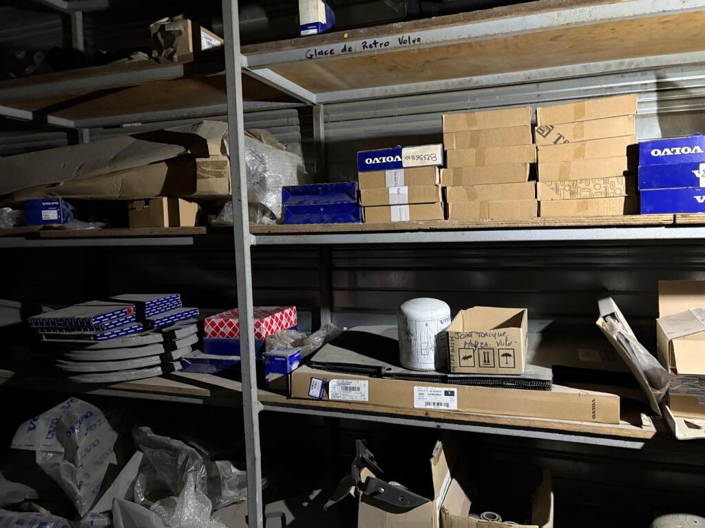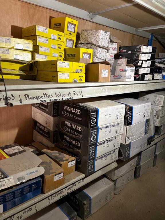 Fort lot de pièces détachées PL dont feux neufs, filtres diverses marques, disques de freins, filtres à air pour pelles, boulonnerie pour les godets, arceaux de bâches, nombreux garde boues et supports, 7 moteurs électriques neufs et autres joints de porte, courroies, glaces de rétroviseur VOLVO optiques, rétroviseurs, galets de malaxeur à béton, lot de caissons d'air, tricstop, fort lot de filtres divers à air, gasoil et hydraulique, plaquettes de freins VOLVO Mercedes, disques, pièces de carrosserie diverses, jantes, silent bloc et petit lot de filtres, plaquette et divers consommations d'entretien de VL, bobines pour soudure et divers